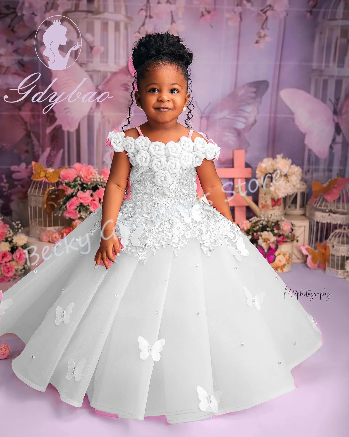 Customized Pink Flower Girl Dresses For Wedding Appliques Butterflies Pearls Cute Kids Birthday Party First Communion Gown