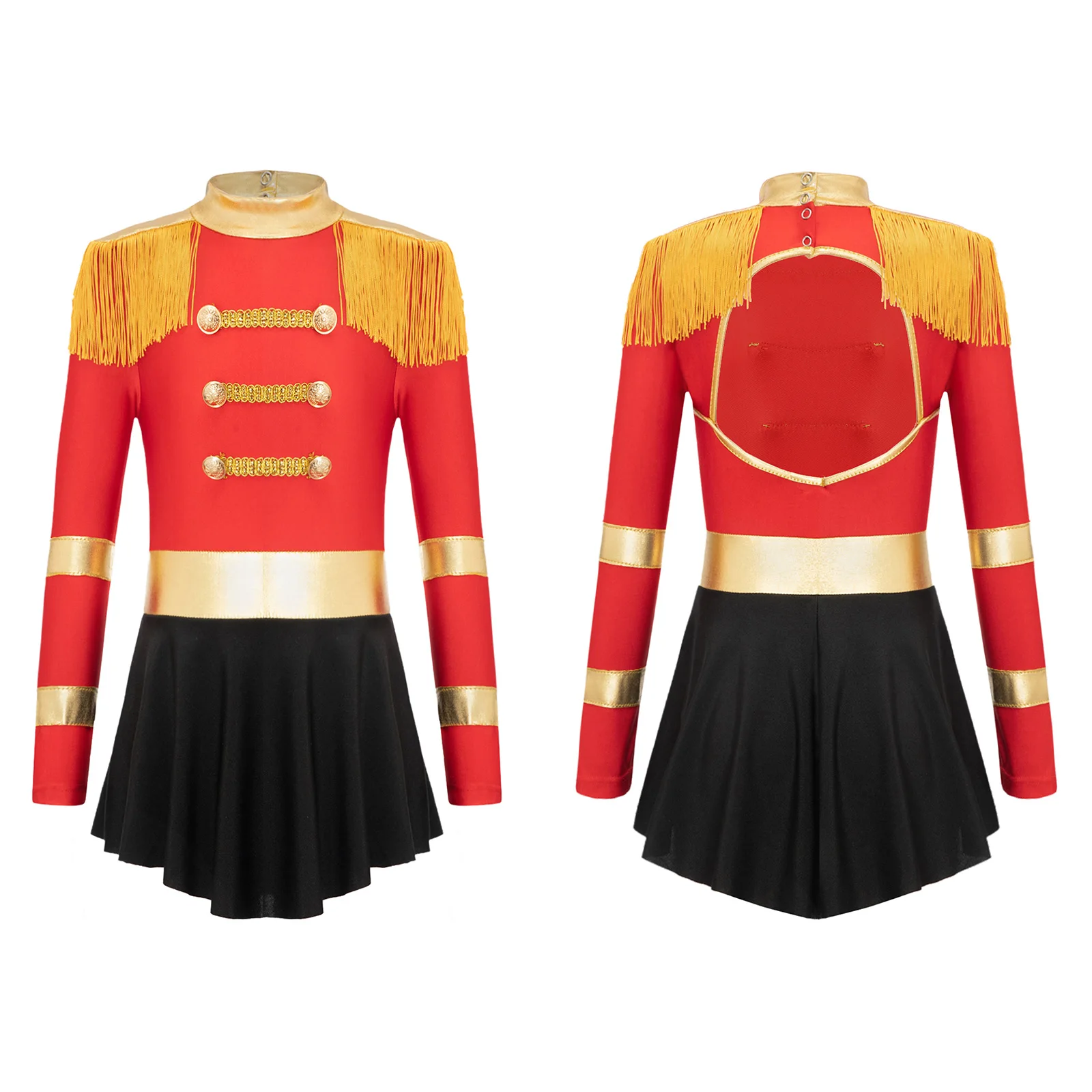Kids Girls Circus Ringmaster Costume Long Sleeve Keyhole Back Fringe Epaulet Leotard Bodysuit Lion Tamer Showman for Carnival