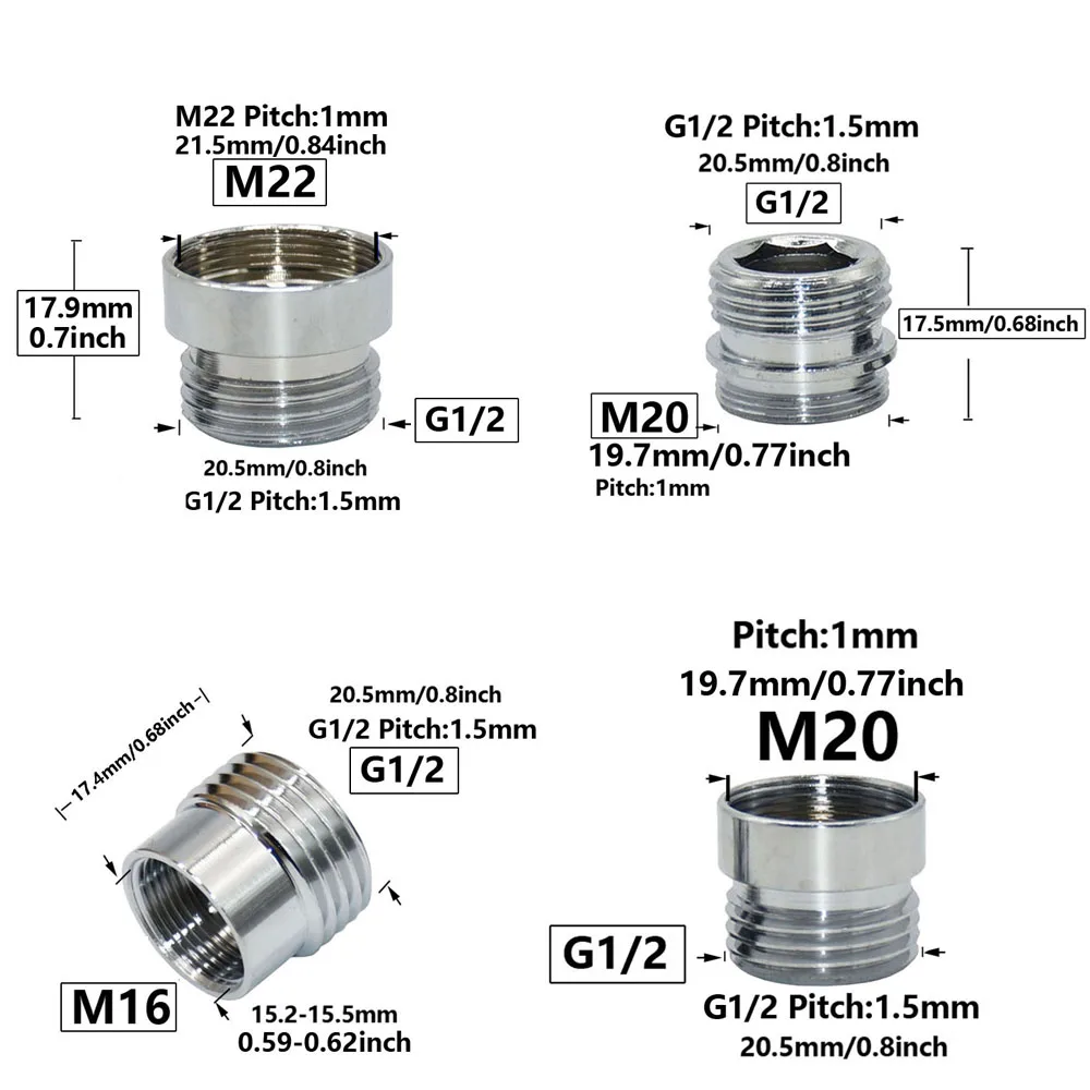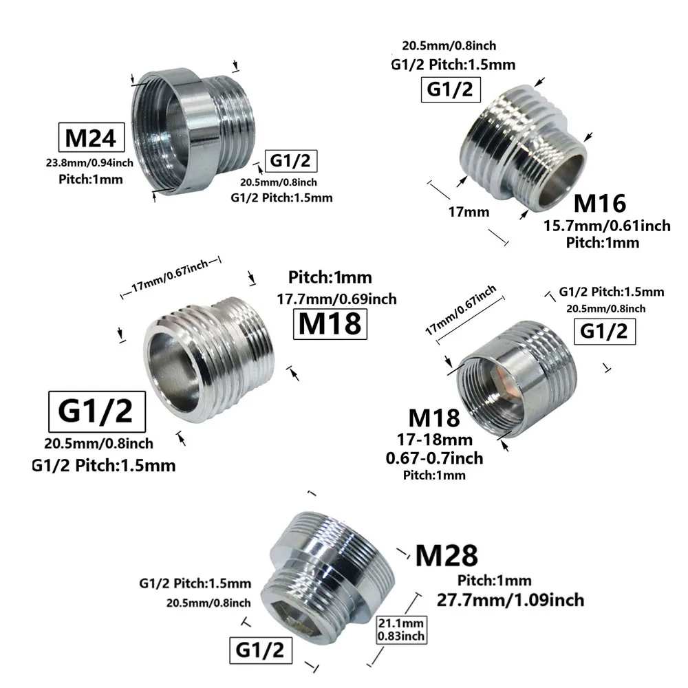 Brass 1/2'' To M16 M18 M20 M22 M24 M28 Thread Connector Silver Water Faucet Thread Fittings For Kitchen Bathroom