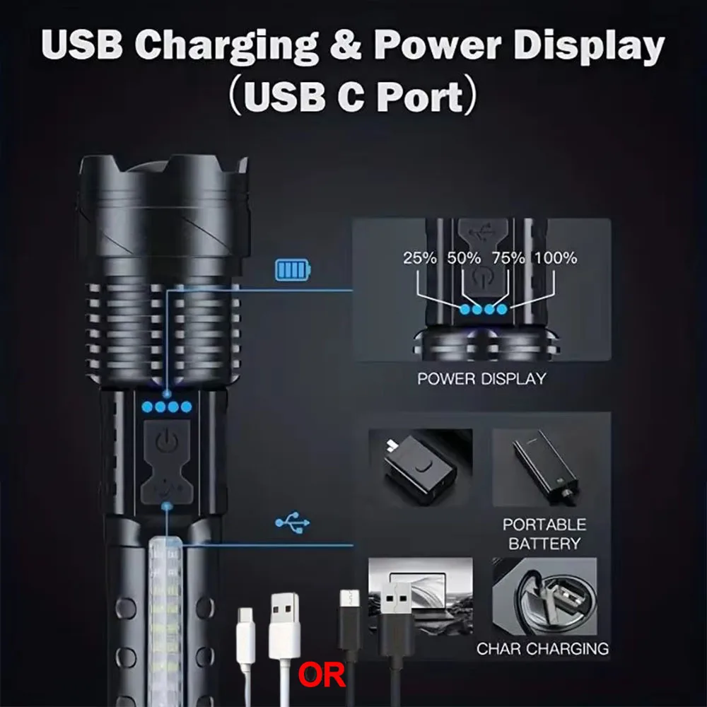XHP50 High Power LED Flashlight Tactical COB Side Light Zoomable Torch Aluminum Alloy USB Rechargeable Waterproof self-defense
