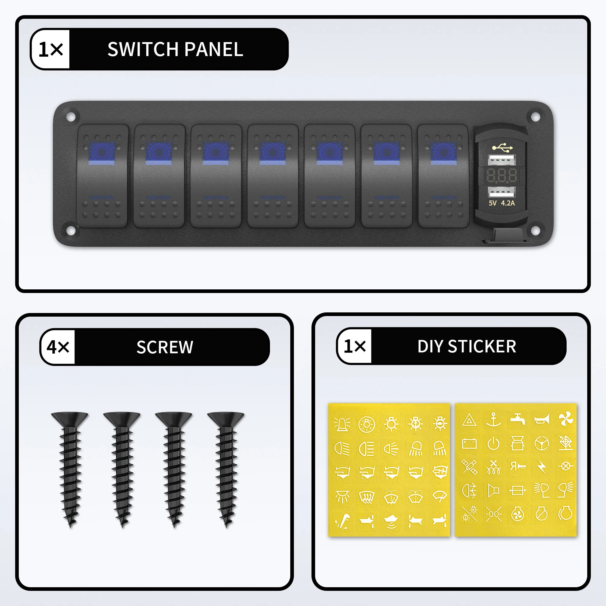 DaierTek 7 Gang Rocker Switch Panel Marine Boat Switch Panel Waterproof with USB Charger Voltmeter for Auto Vertical UTV Truck