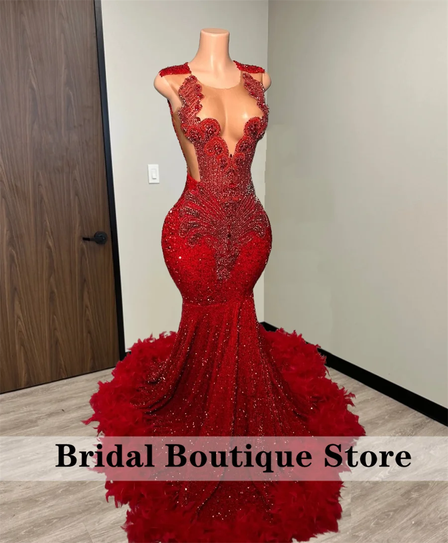 Luxury Red Prom Dress For Black Girls Crystal Beads Gems Sequins Feathers Party Dress Wedding Reception Gowns Customized