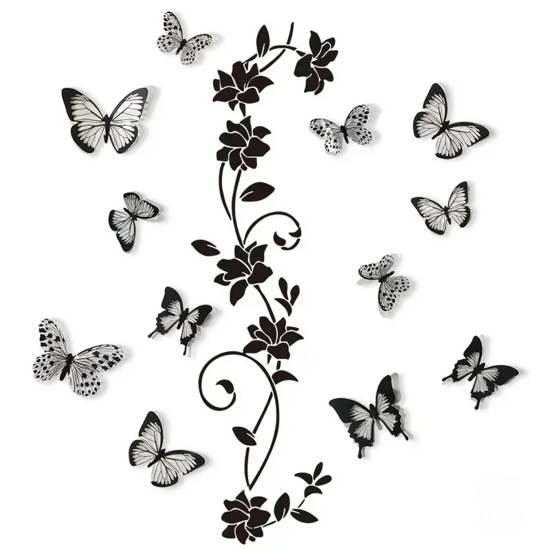 Black Flower Vine 3D Butterfly Wall Sticker Background Wall Bedroom Room Decoration Removable Wall Sticker