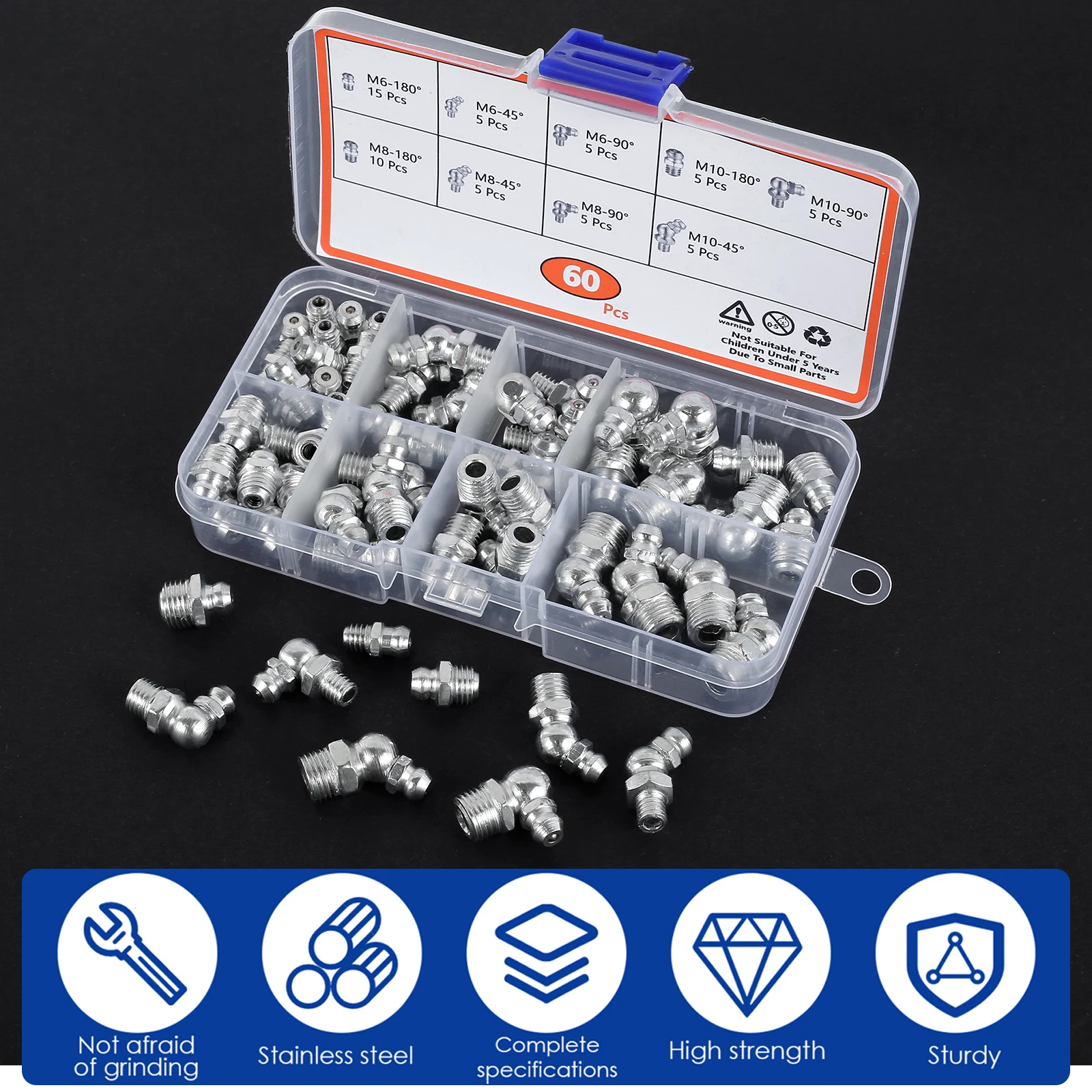 60/120Pcs Metric Grease Fitting Assortment Straight 45°/90°Angle Galvanized Metal Grease Nipple With Storage Box