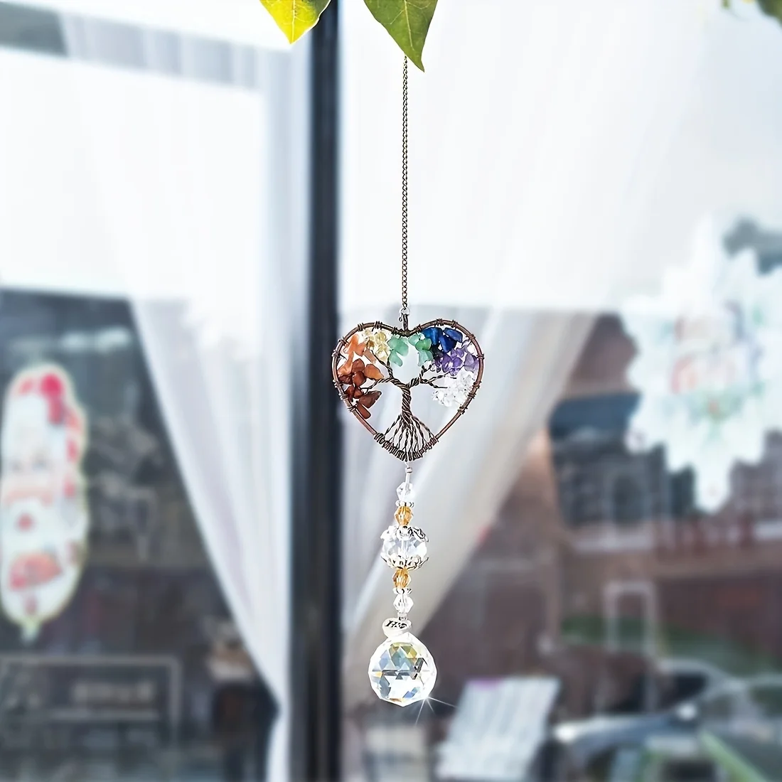 1pc Rainbow Crystal Sun Catcher, Tree Of Life Suncatchers Heart Shaped Hanging Ornament Chakra Stones Window Crystal Ball Prism