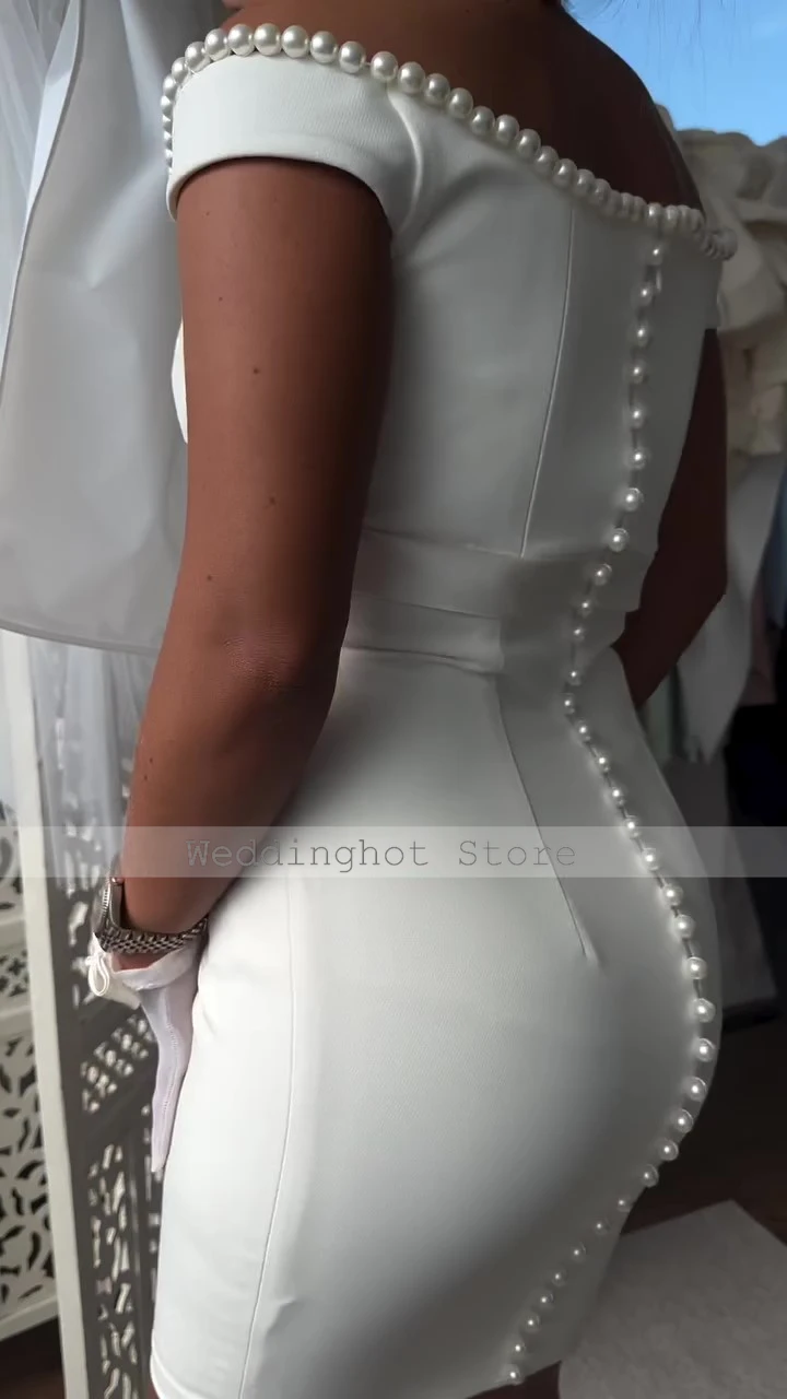 Sheath Cocktail Dresses for Women Pearls Off the Shoulder V Neck Belt Column Cocktail Gowns Ivory Short Formal Party Dress Mini
