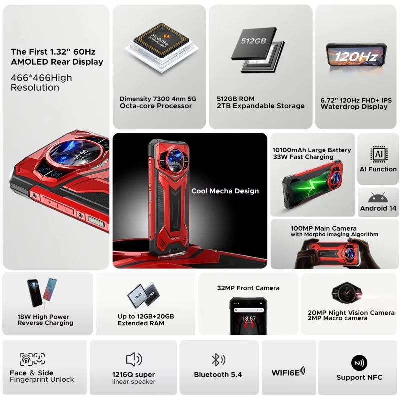 World Premiere DOOGEE S200 Plus 5G AI Rugged Phone Dimensity 7300 1.32'' Rear Display 12+512GB 6.72'' 10100mAh Battery Smartphone