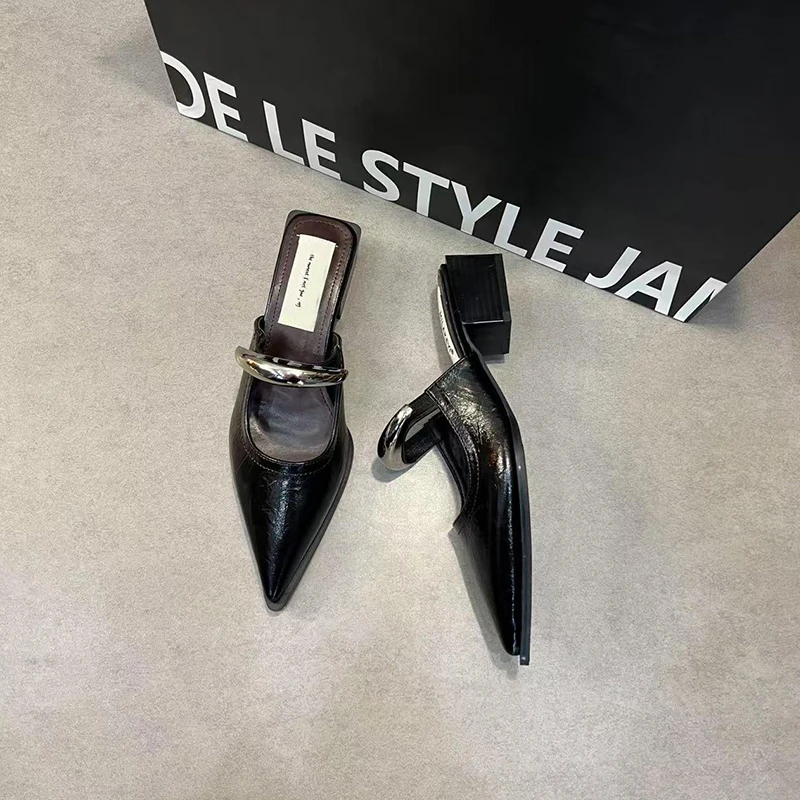 Summer Women Cover Toe Mules Slippers Fashion Metal Decoration Thick Heel Slide Shoes Comfort Street Style Footwear
