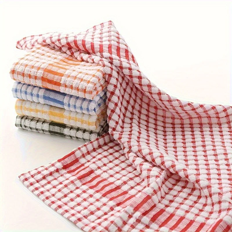5pcs Absorbent Plaid Dish Towels - Reusable Kitchen Cleaning Cloths in Assorted Colors (Red, Blue, Orange, Yellow, Green)