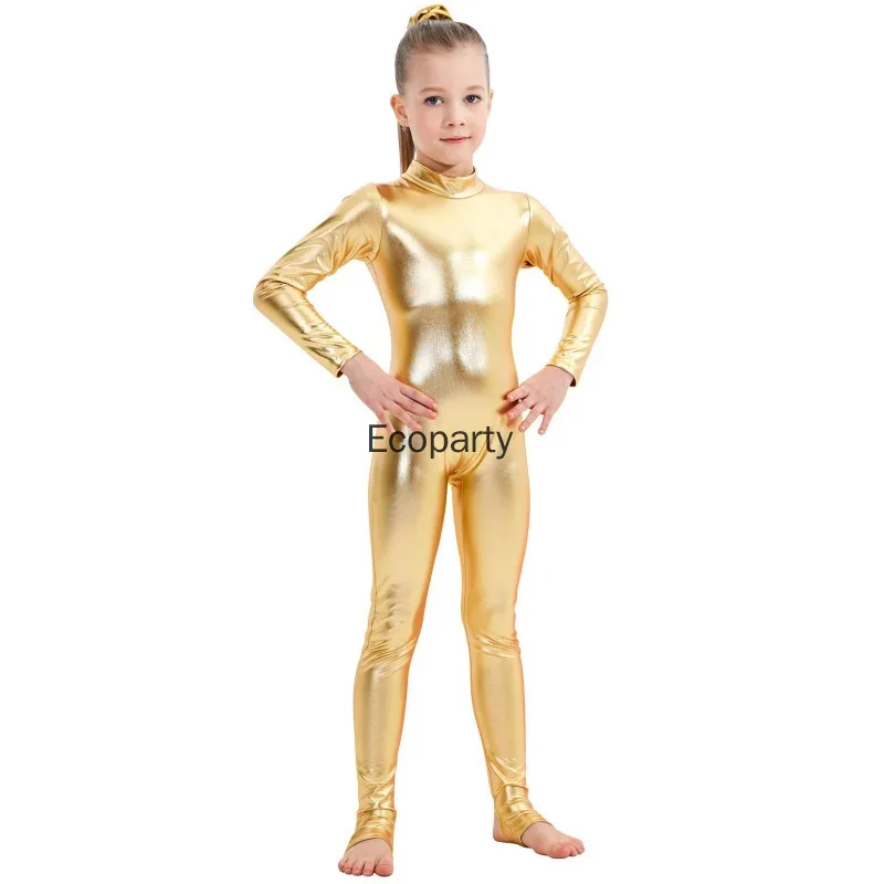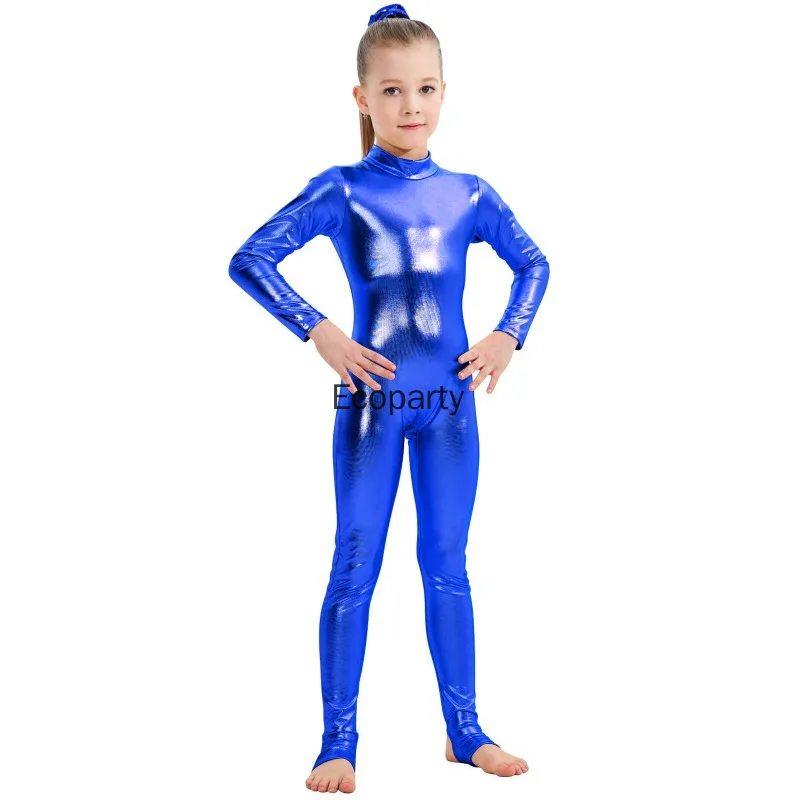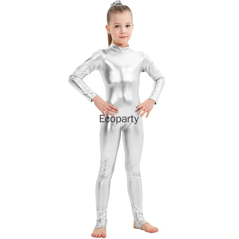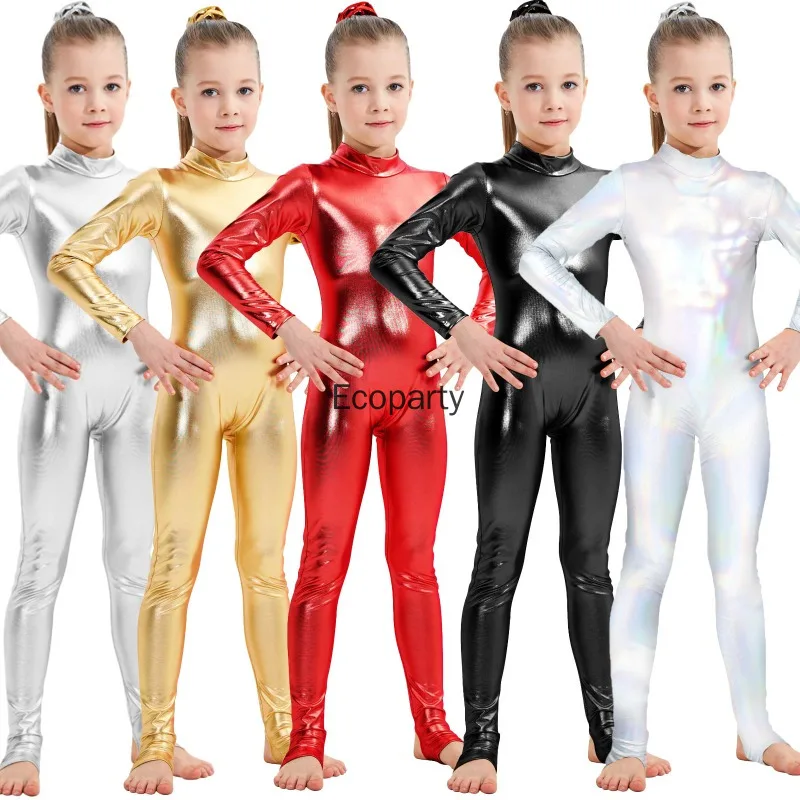 Kids Shiny Metallic One Piece Long Sleeves Full Body Gymnastics Ballet Dance Leotard Jumpsuit Girls Stretchy Unitards Dancewear