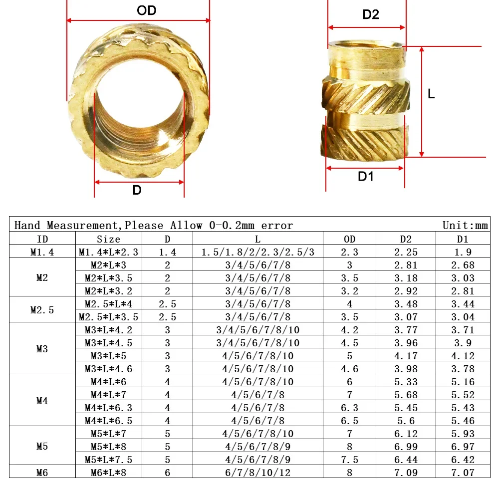 M2 M2.5 M3 M4 M5 M6 M8 M10 Brass Heat Insert Nut Double Twill Knurle Molding Injection Embedment Thread Hot Melt Nuts 3d Printer
