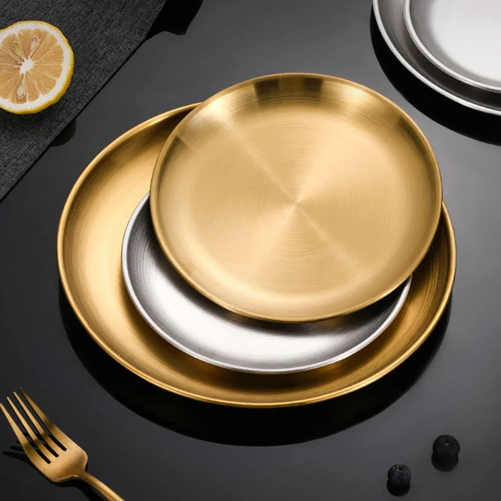 8PC Metal Dining Dish Stainless Steel Round Plate Shallow Tray 14/17/20/23/26cm BBQ Picnic Camping Food Container Tableware Set