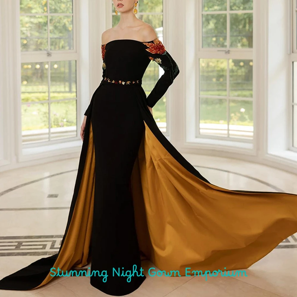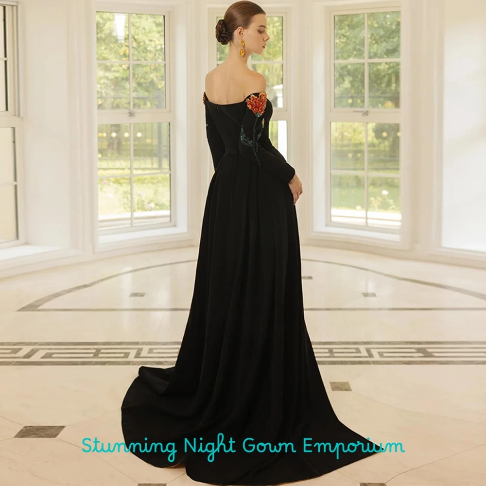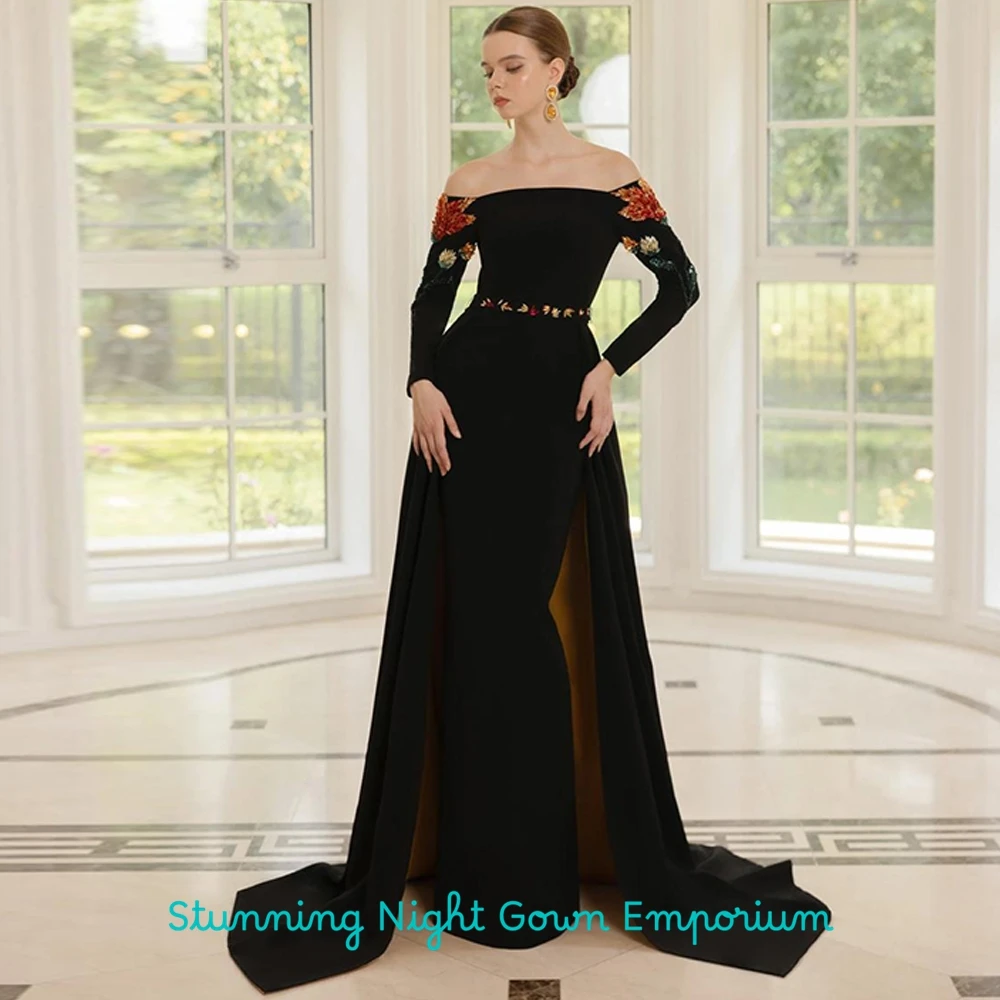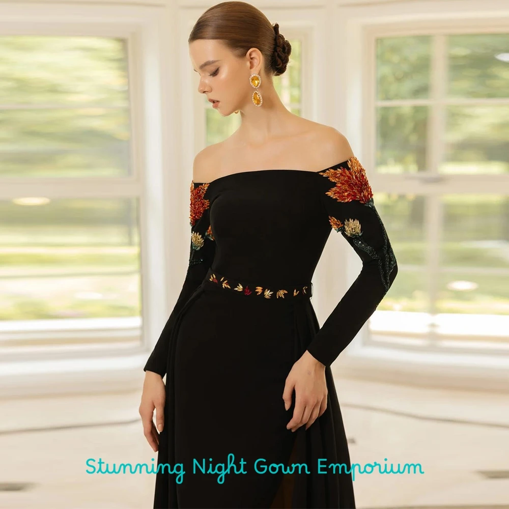 Exquisite Black Jersey Evening Dress Boat Neck Long Sleeves Bespoke Occasion Gowns Delicate Crystal Customized Prom Dresses