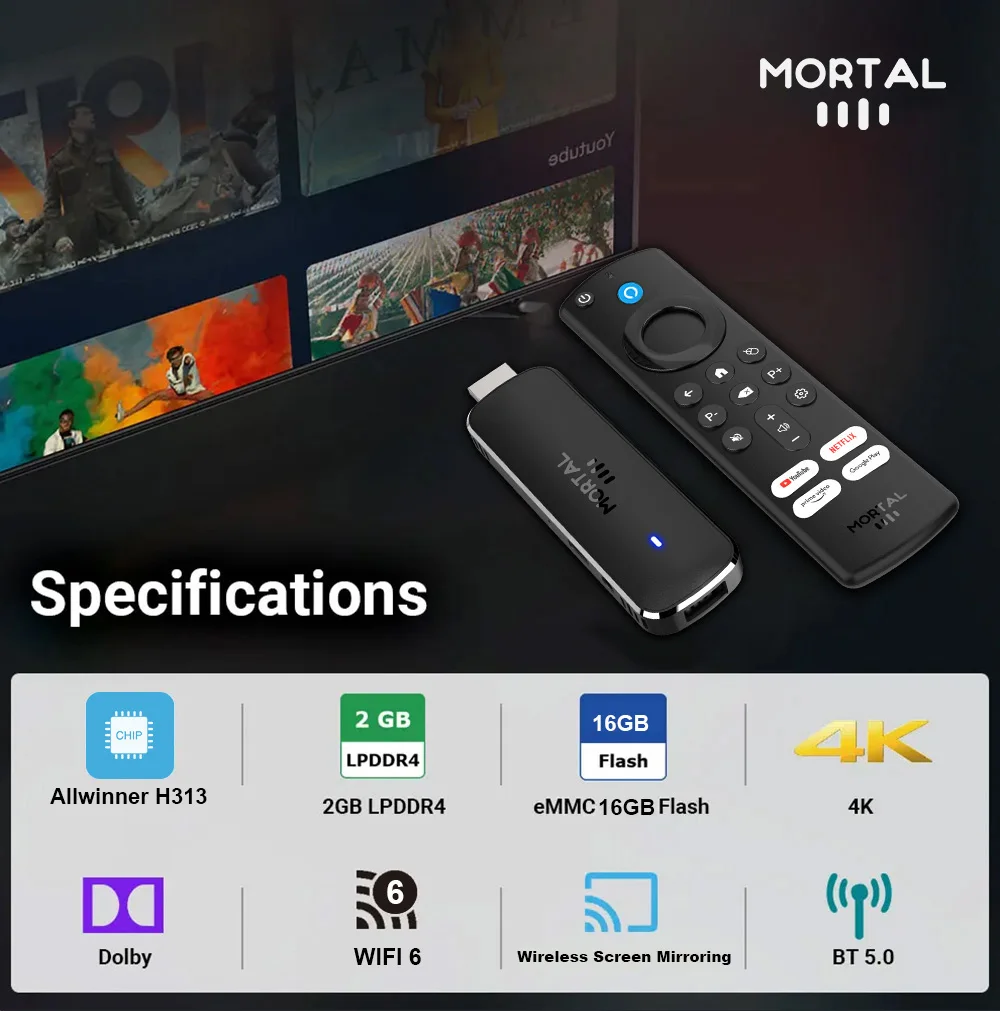 Mortal Android 14 TV Stick Full HD 4K 1080P WiFi 6 Google Voice NETFLIX Youtube Q8 BT5 24Fps Wireless Video Decode Media Player