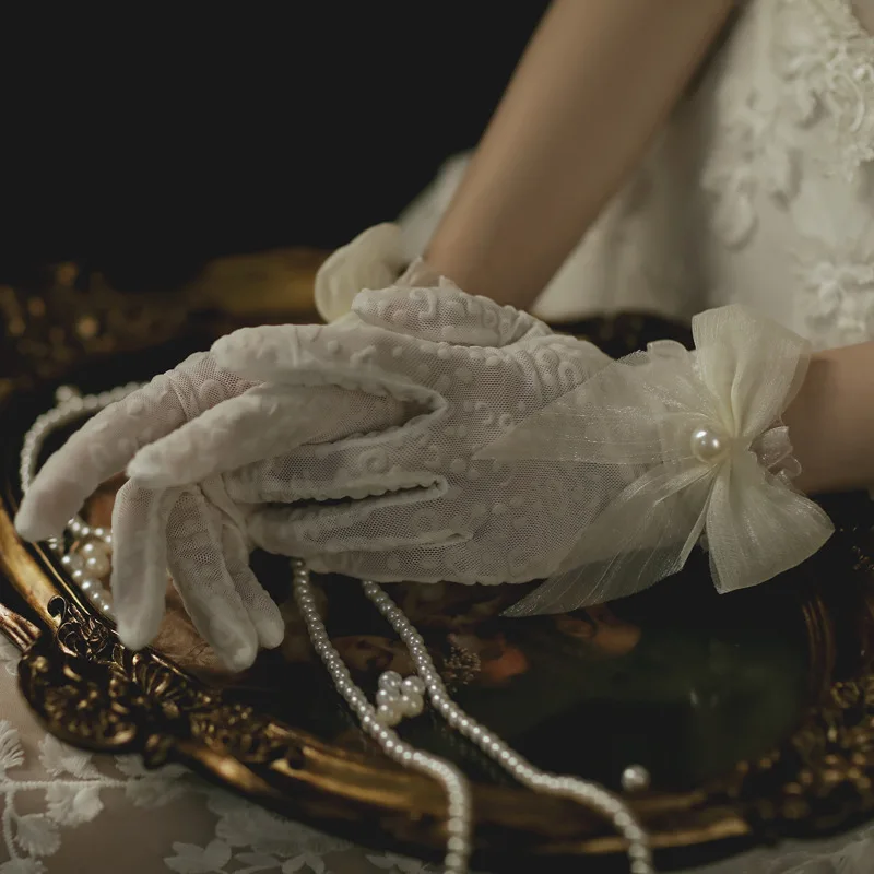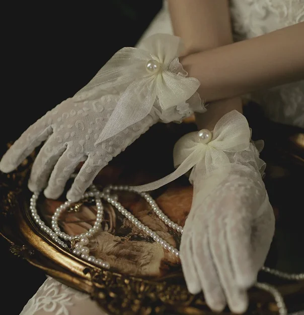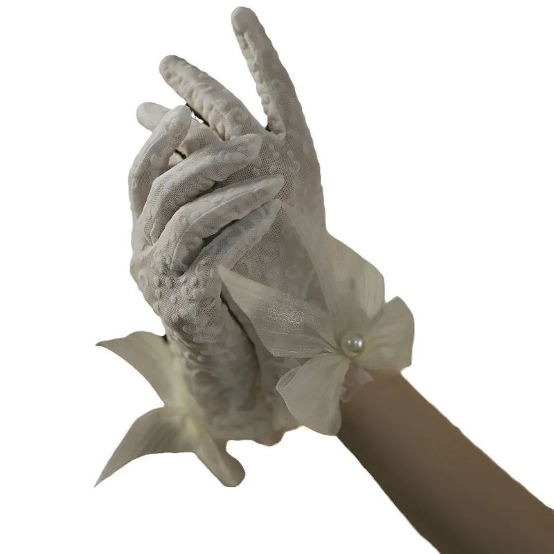 Bridal Lace Wedding Gloves Milk White Short Bag Finger Bow Pearl Daily Style