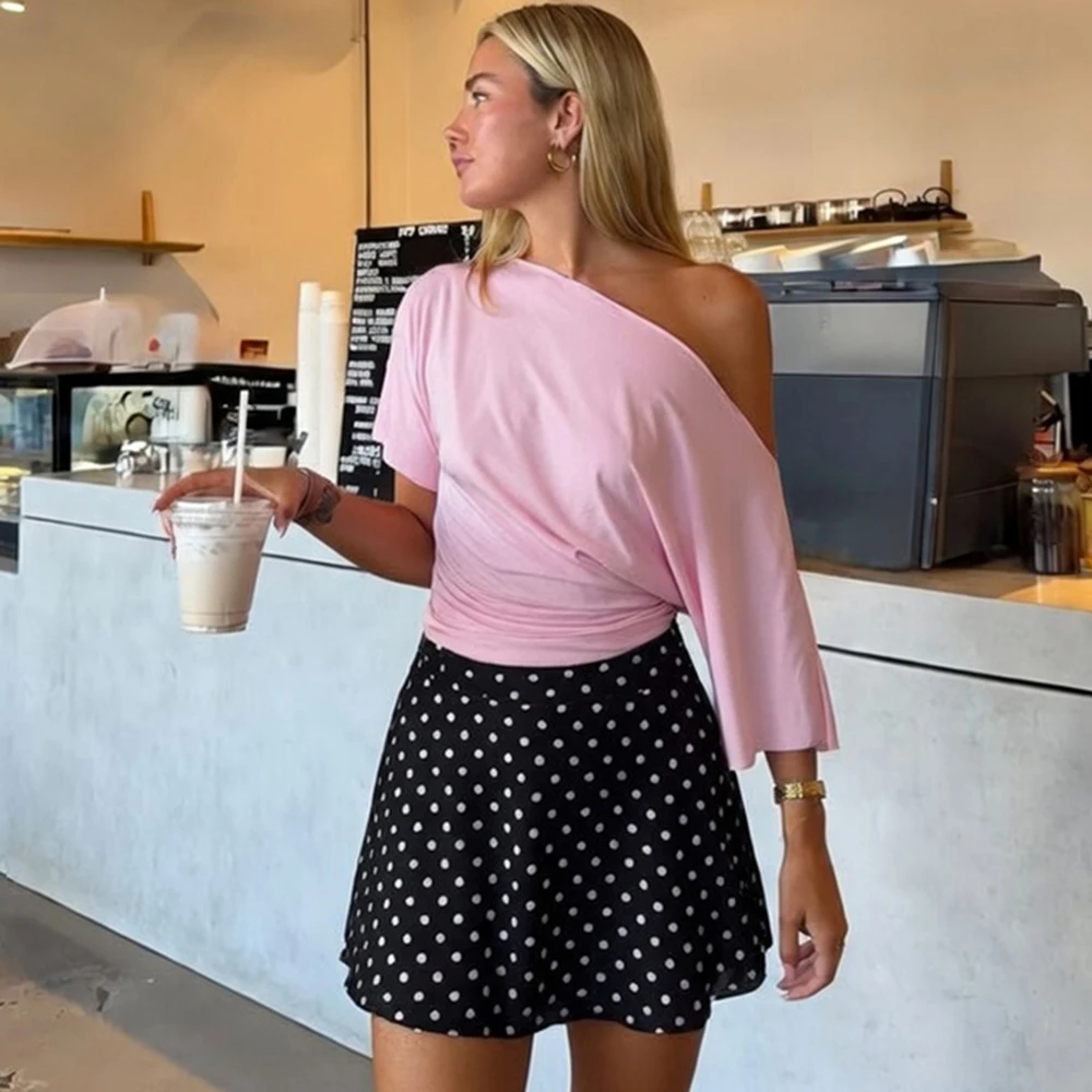 Talenza Summer One Shoulder Tops Fashion Slim Shrink Short Sleeve T-Shirts Party Y2k Streetwear Solid Pullover Tops Women