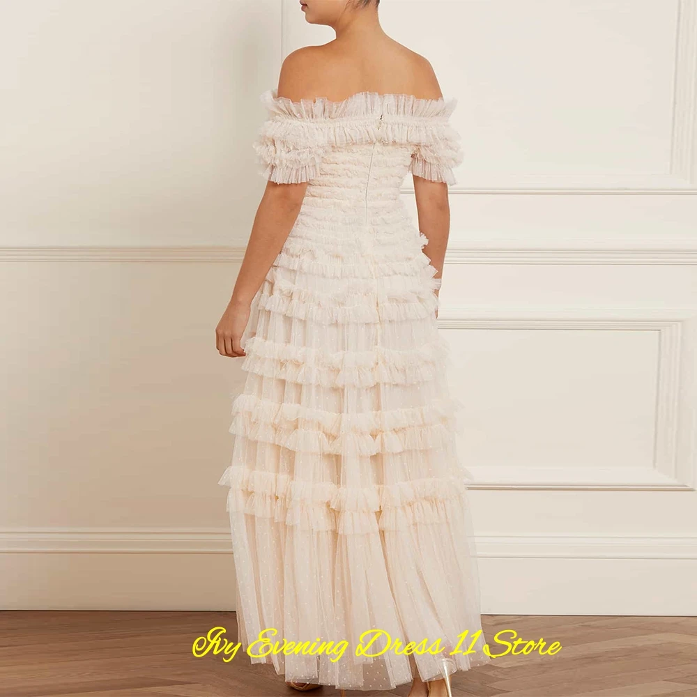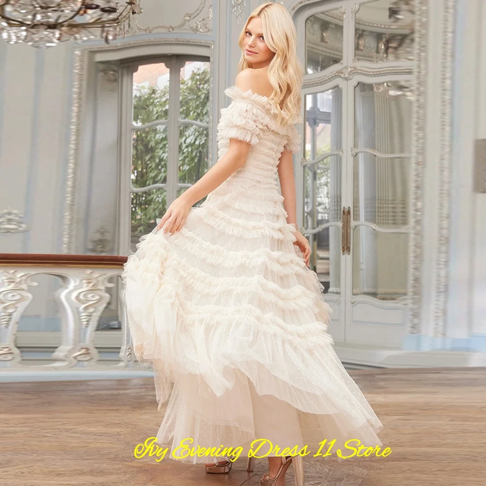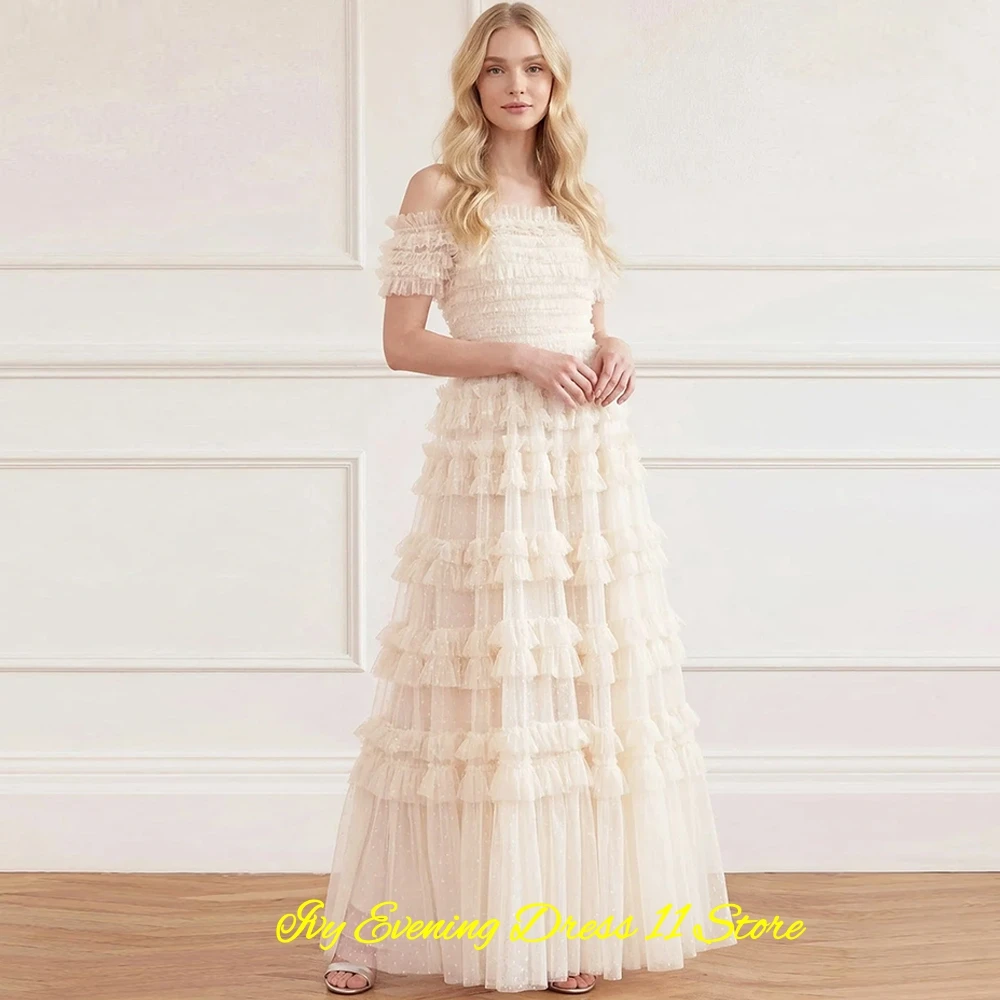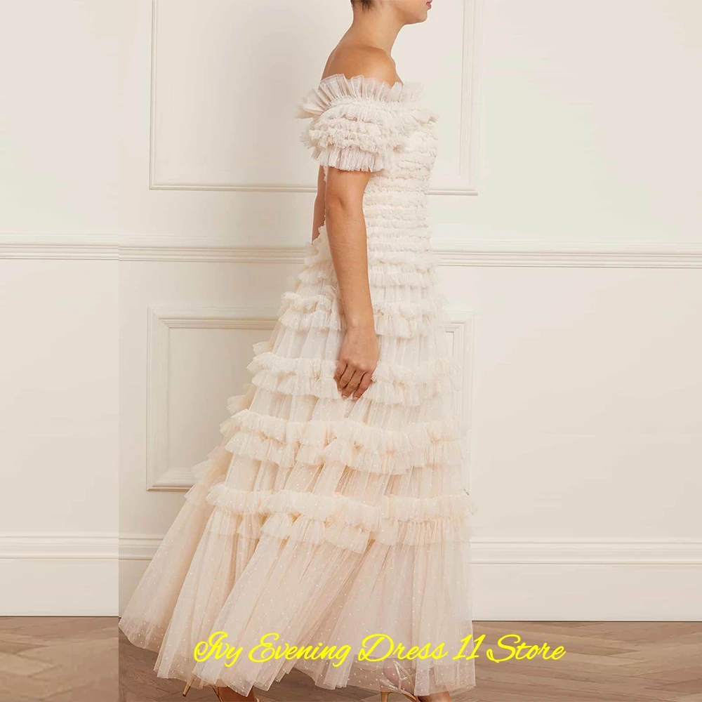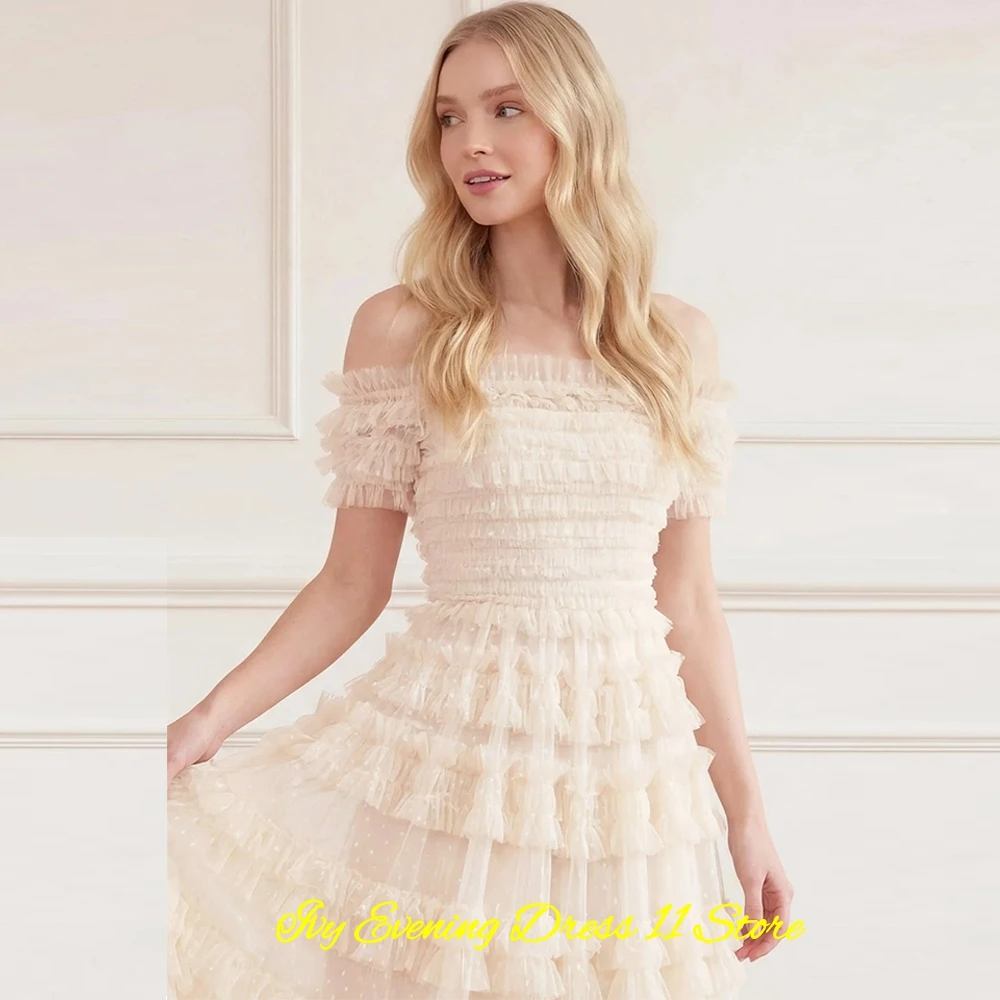 Simple Boat Neck Tulle Evening Dress Fashion Tiered Prom Dresses Delicate Short Sleeves Customized Special Occasion Gowns