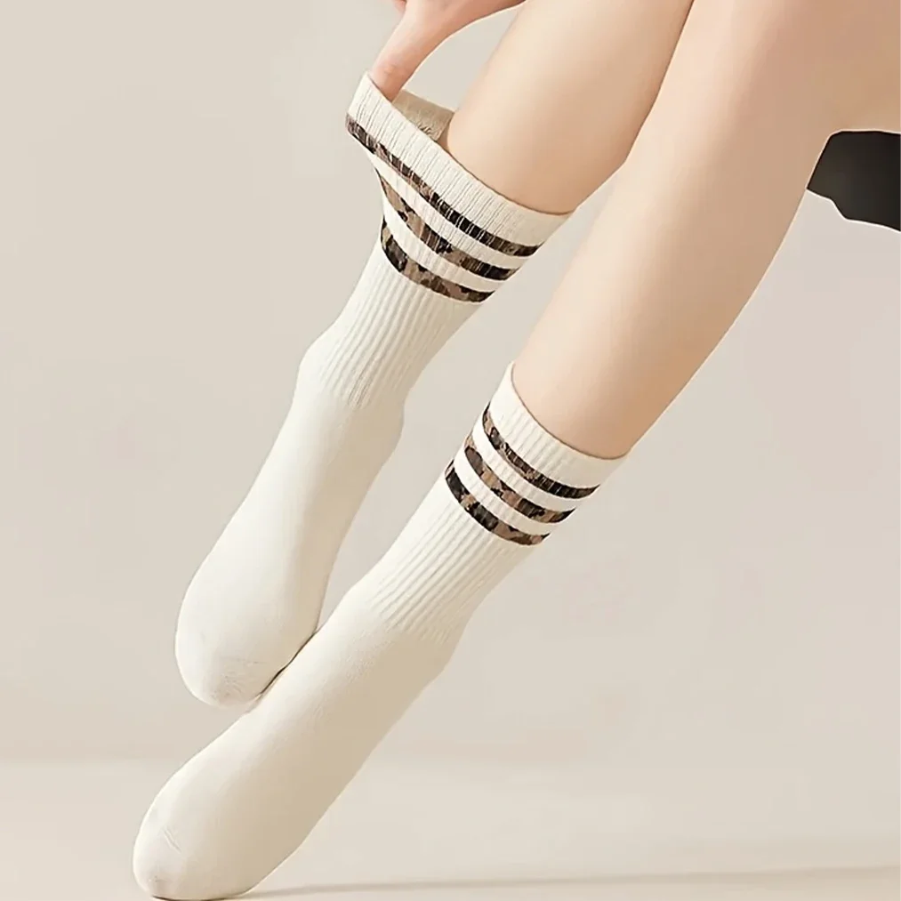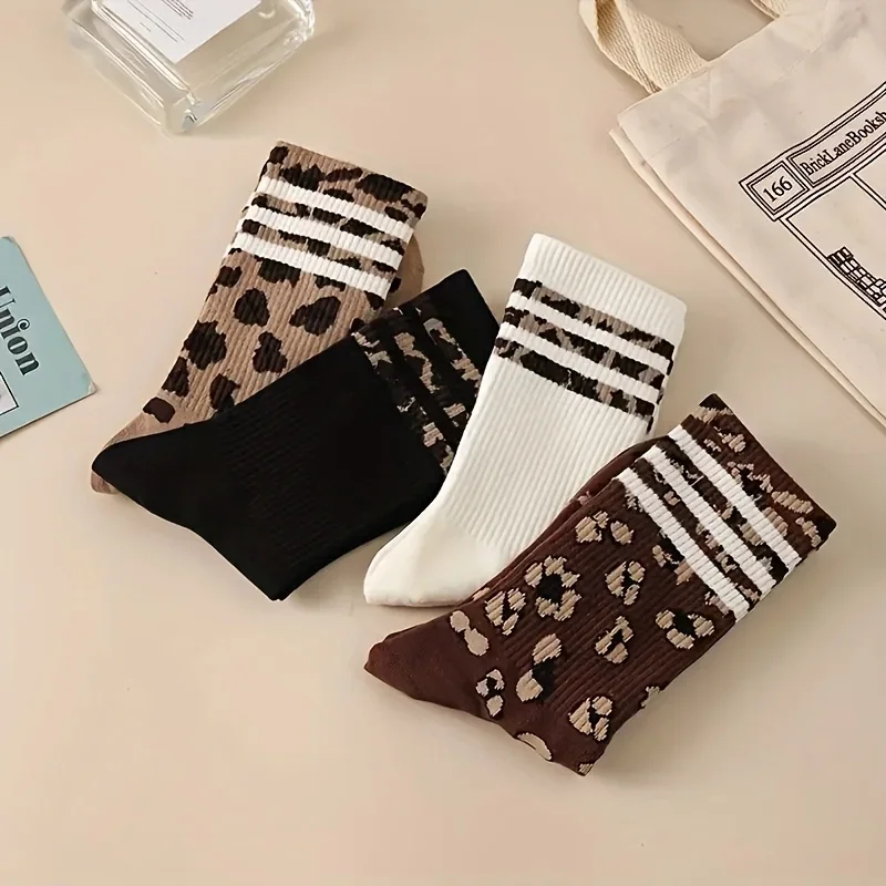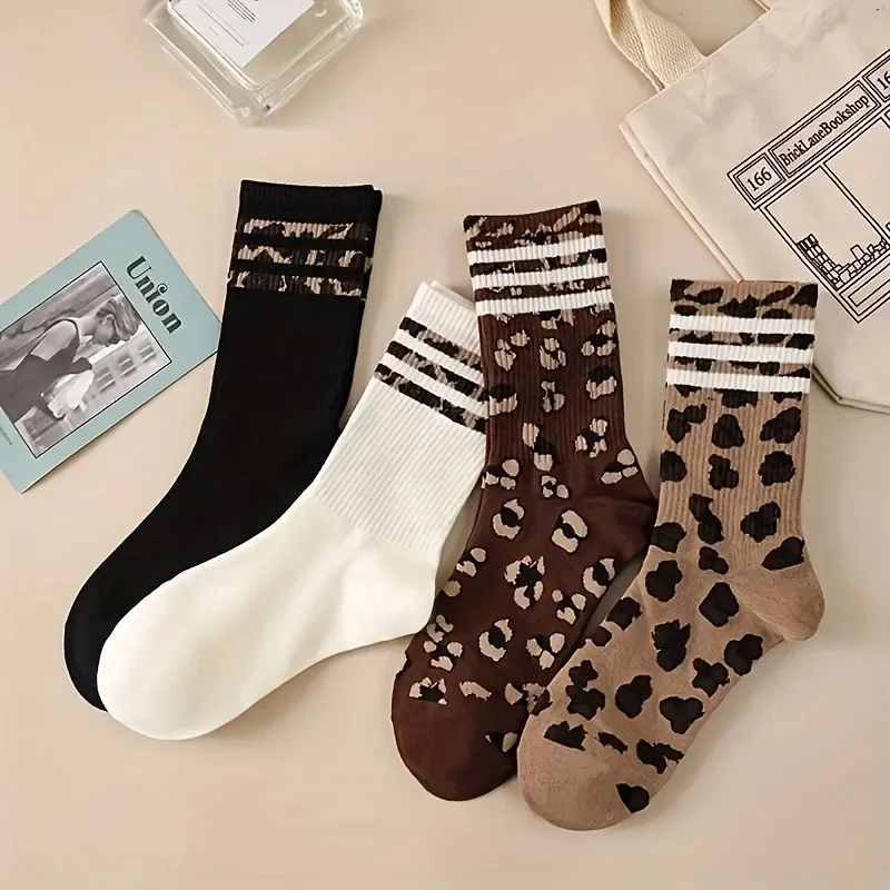 4 Pairs Women's Striped Socks Soft Comfortable Casual Sports Sock Leopard Print Breathable Fashion Middle Tube Sox High Quality