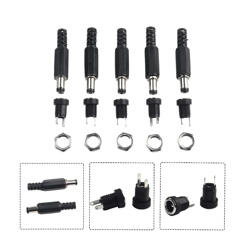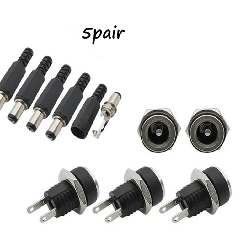 5 Pair DC 12V Male Female Socket Panel Mount Barrels Jack Plug Power Connector Female Jack Screw Nut Panel Mount Connector