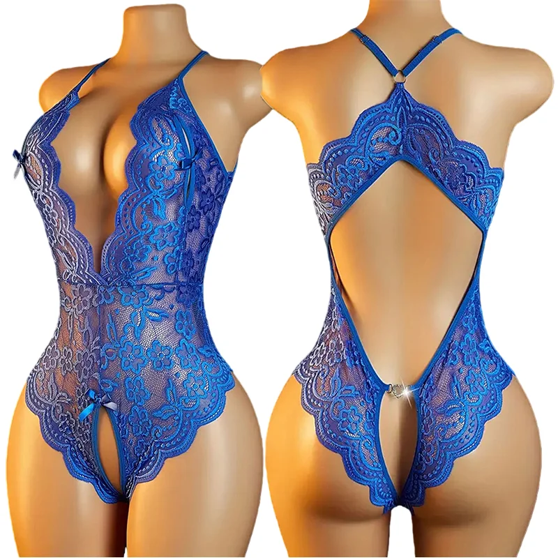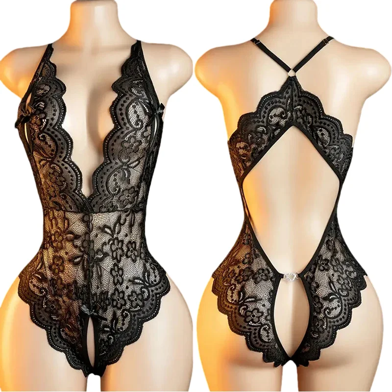 Crotchless Lingerie Women Lace Panties Costumes Hot Babydoll Bodysuit Lace Hollow Deep V Open Bra Thongs