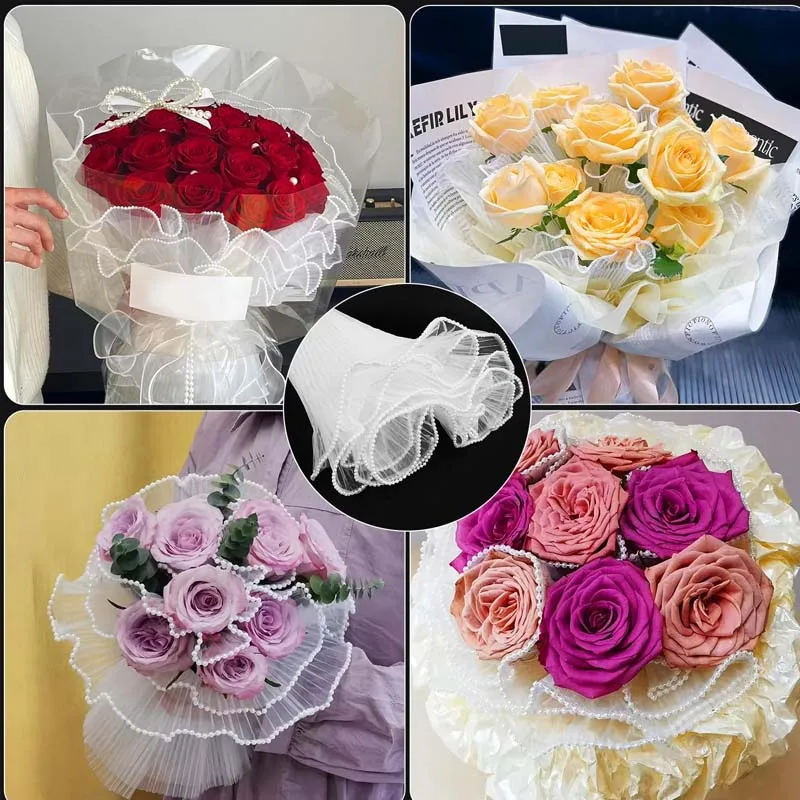 White Floral Packaging for Bouquets Including Decorative Mesh Wrapping Paper, Pearl-Edged Wrapping Paper, Wrinkled Wave Mesh