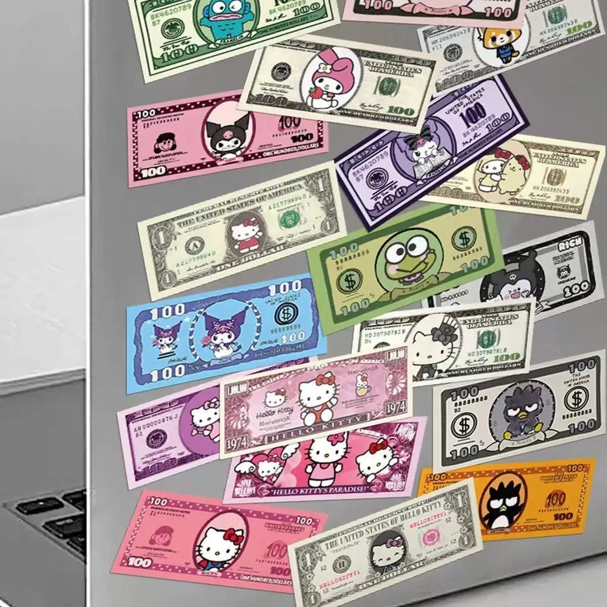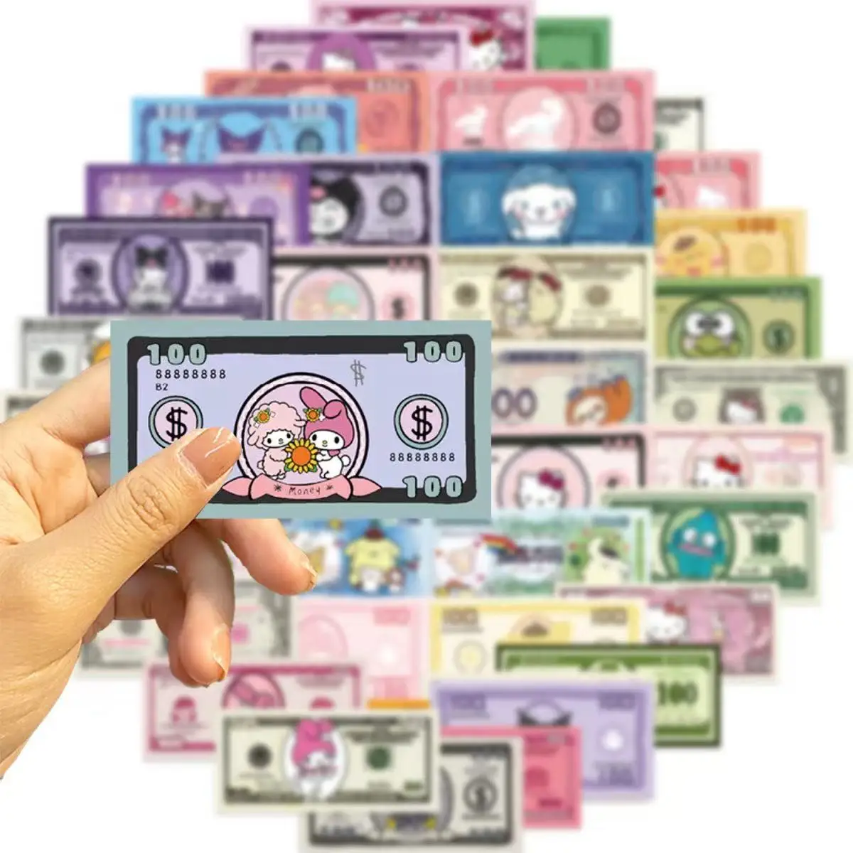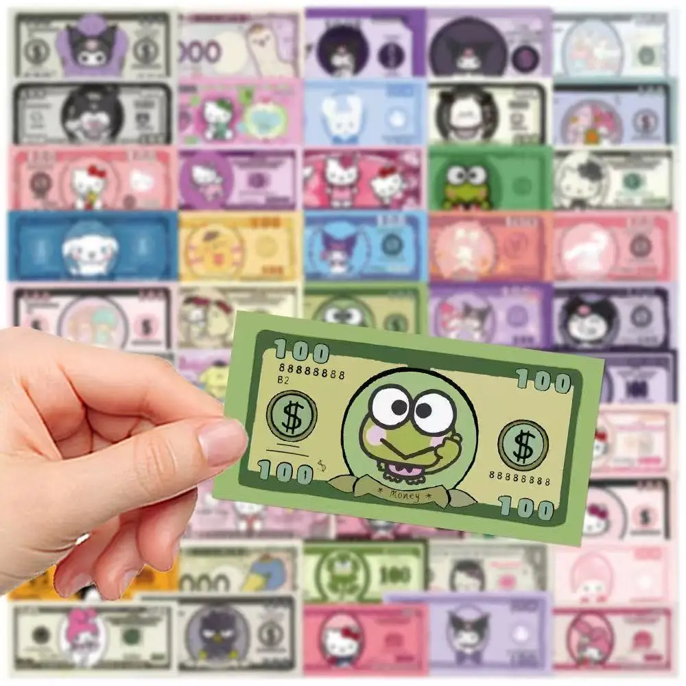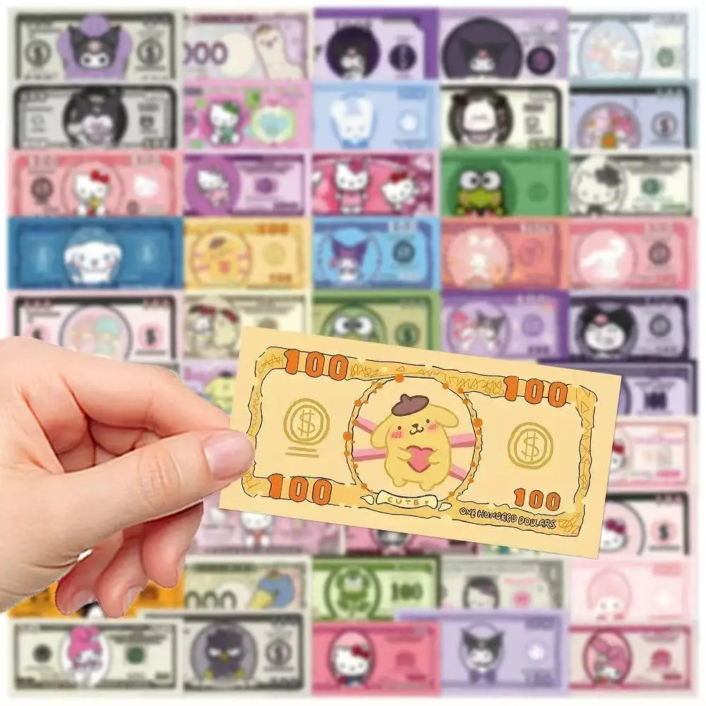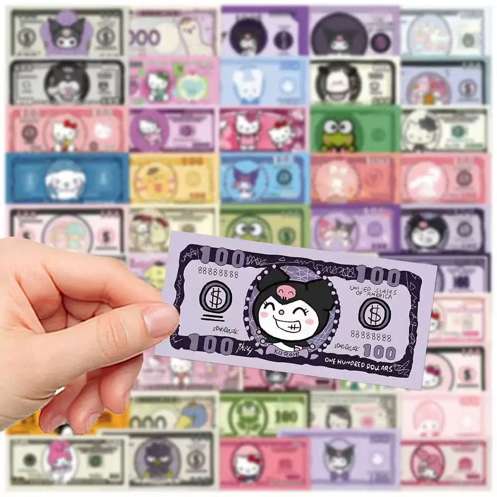 50PCS Kawaii Cartoon Money Stickers, Hello Kitty Kuromi Characters Banknote Decals for Laptop Journal Scrapbook Decor