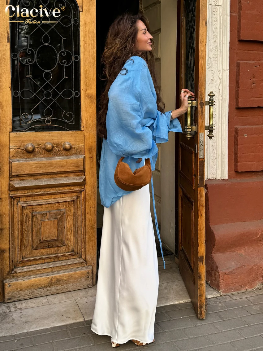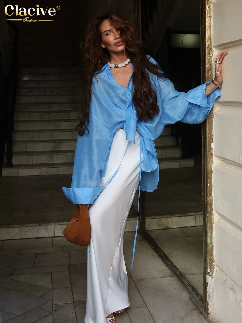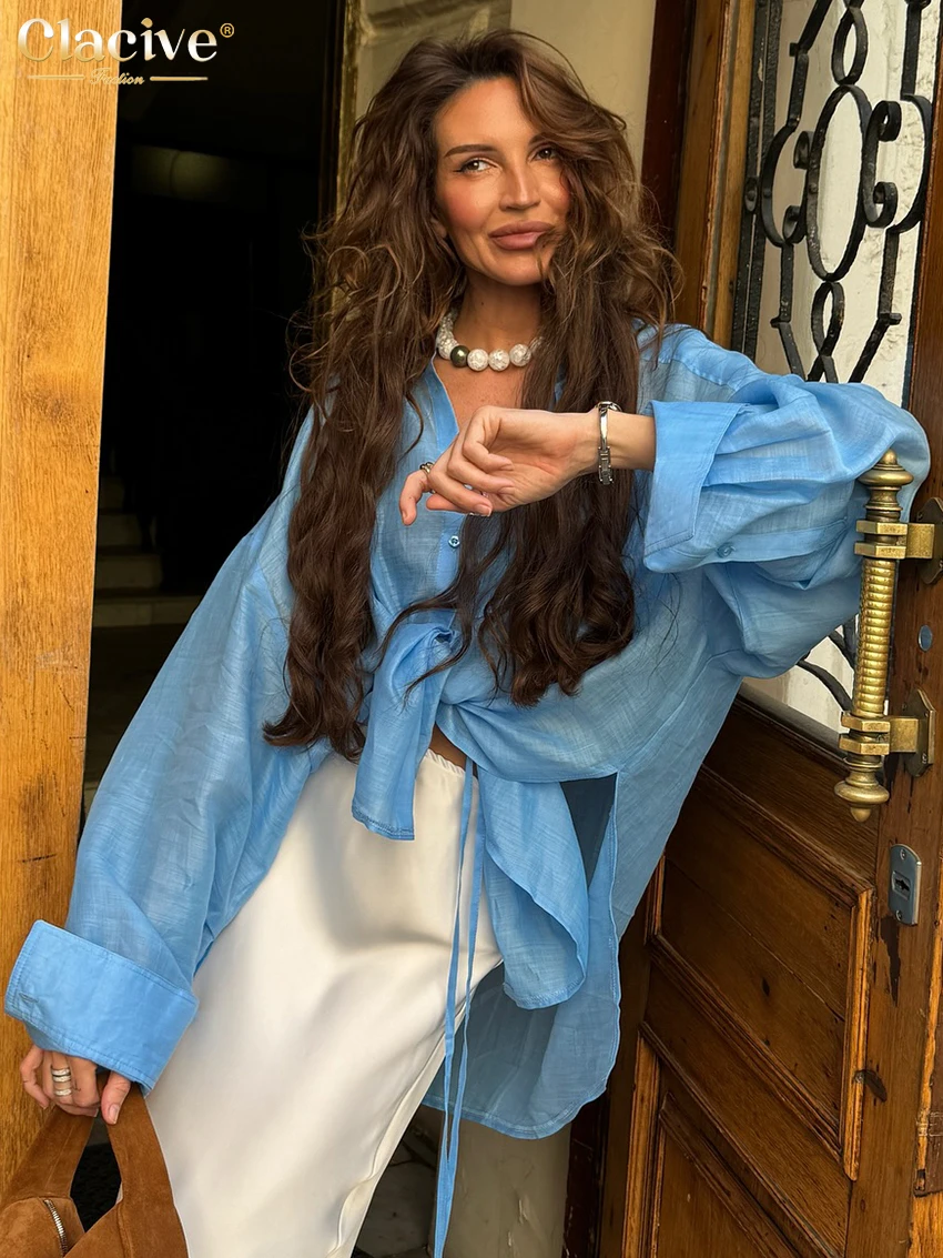 Clacive Fashion Loose Blue Women's Blouse 2025 Lapel Long Sleeve Shirt Elegant Classic Solid Blusas Tops Female Clothing