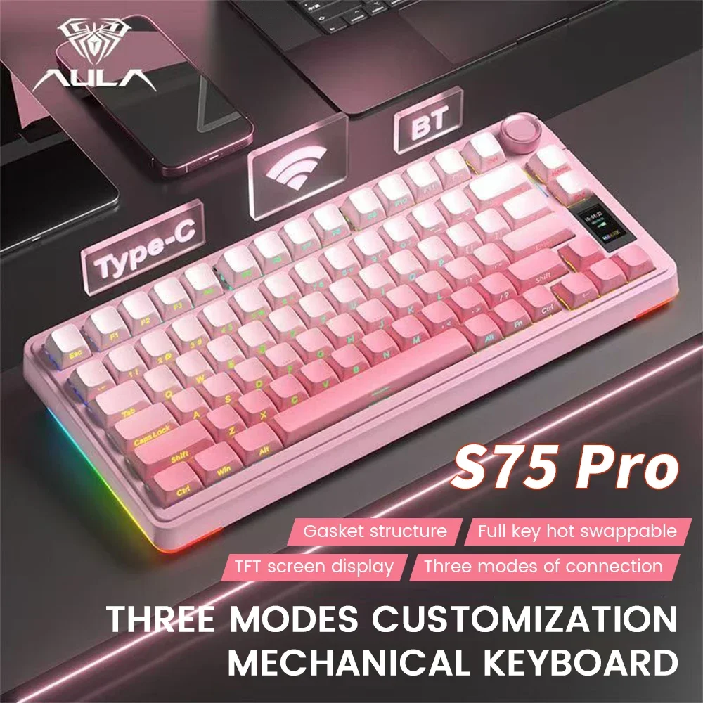 AULA S75Pro Mechanical Keyboard PBT Keycaps 75% Hot Swappable RGB Backlit 4000mAh Wireless Gamer Keyboard with LED Screen Knob