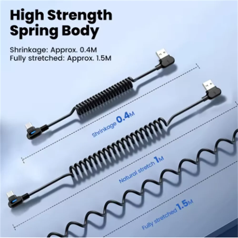 1m/1.5m Elbow LED Super Fast Charging Cable USB To Type C Spring Cable For iPhone Samsung Xiaomi USB-C Car Phones Charging Cord