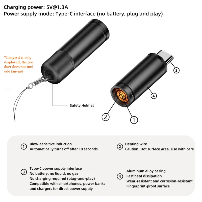 Type C USB Rechargeable Windproof Electric Lighter Flameless Igniter with Blow to Ignite for Outdoor Travel Safety