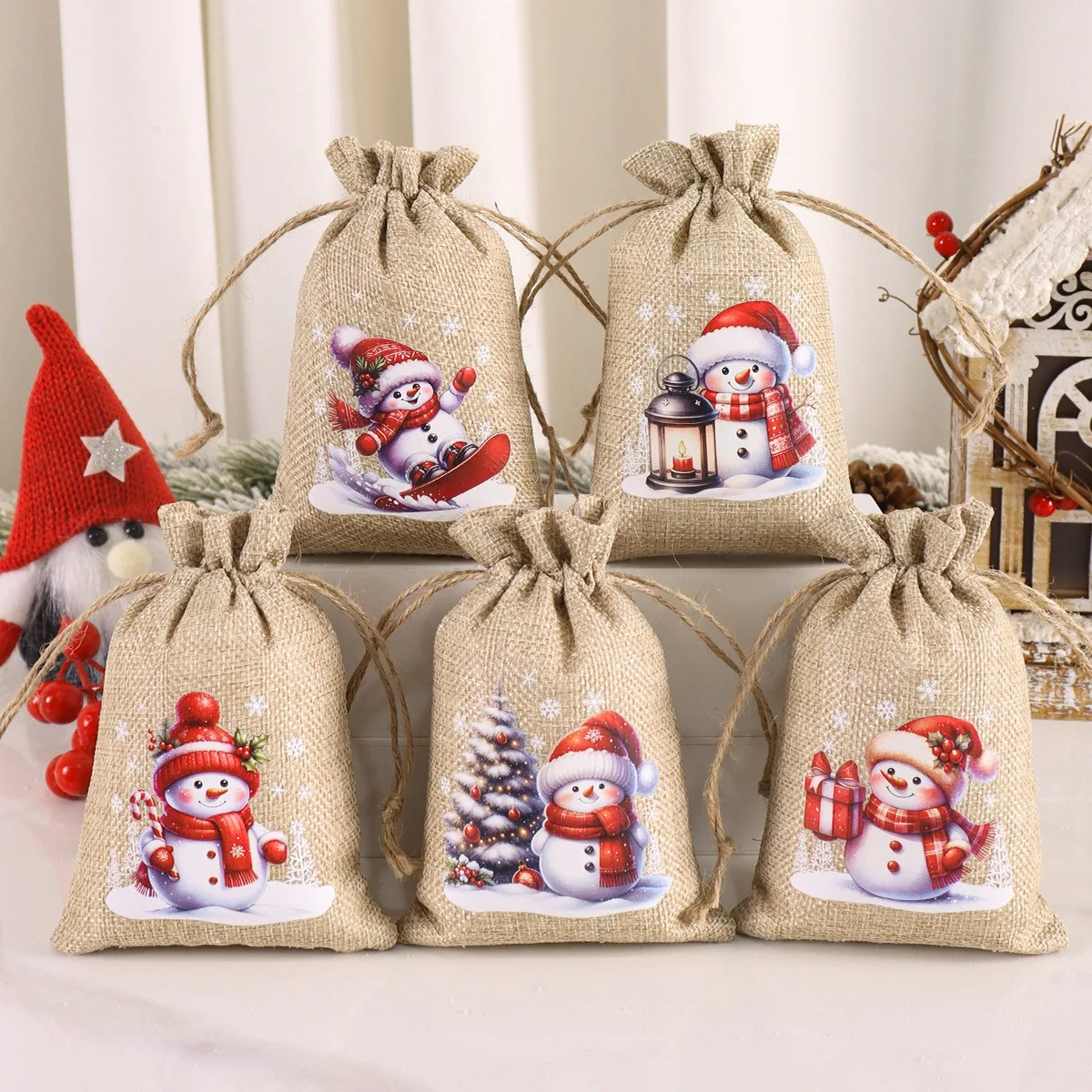 6pc Christmas Linen Drawstring Bags Burlap Gift Bags Candy Biscuits Pouchs for Home Decor 2025 Xmas Navidad Noel Gift Packaging