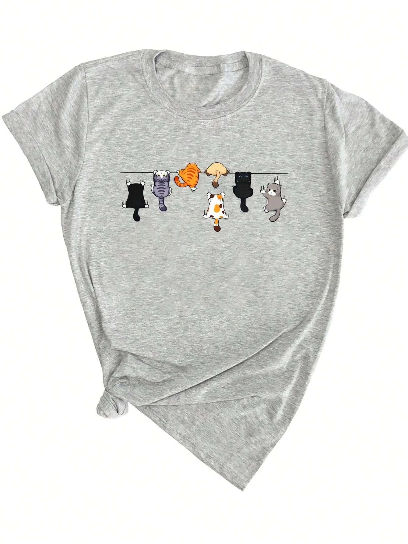 Women's Oversize Cute Cat Print Round Neck Short Sleeve Casual T-Shirt White Short Sleeve with Cat Clothing Tee Female Tops