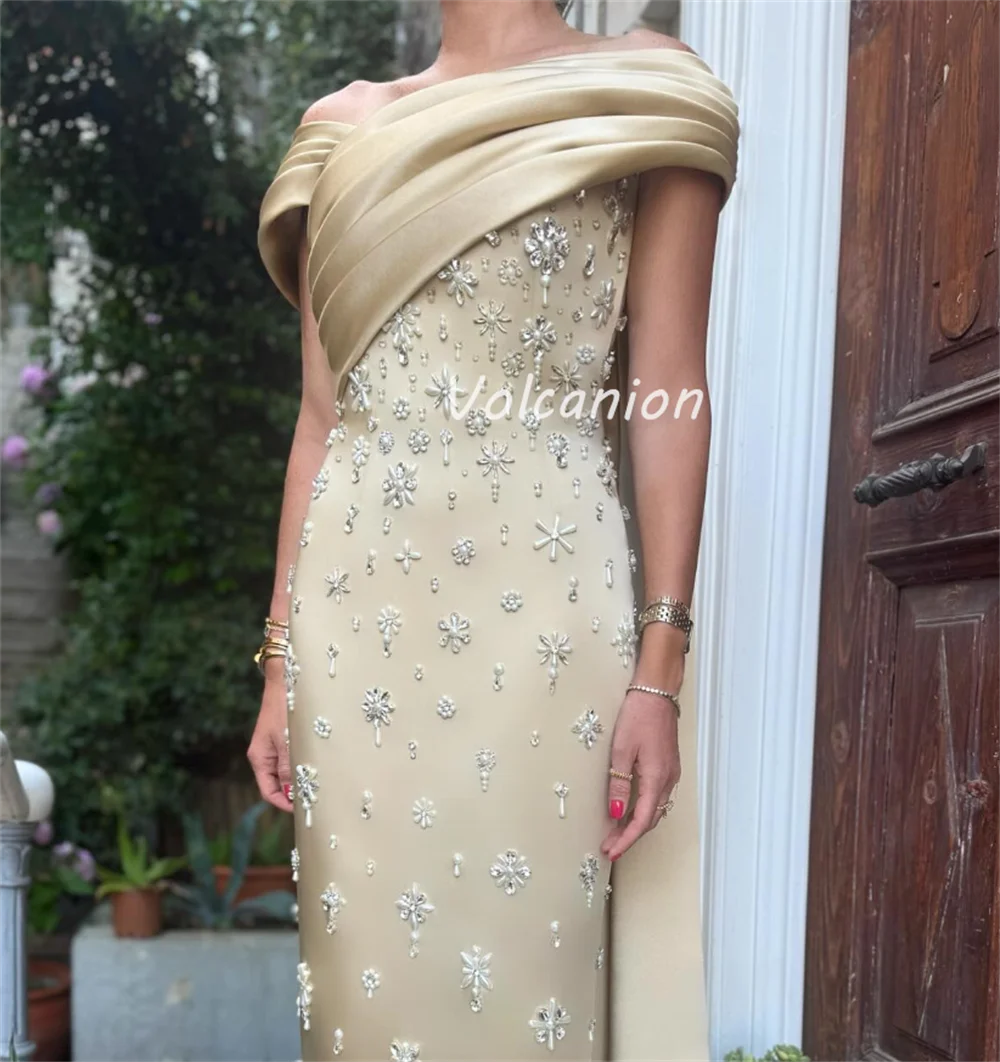 Customized Exquisite Elegant Charmeuse Rhinestone Pleat Straight Off-the-shoulder Long Dresses Bespoke Occasion Dresses Formal
