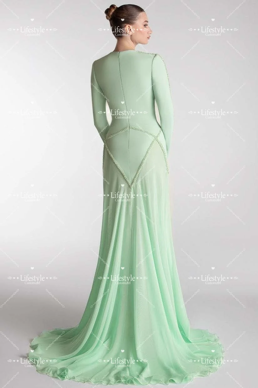 Customized Mint Round Neck Prom Dresses 2025 Long Sleeves Beads Luxury Evening Dress Long Wedding Formal Party Gown