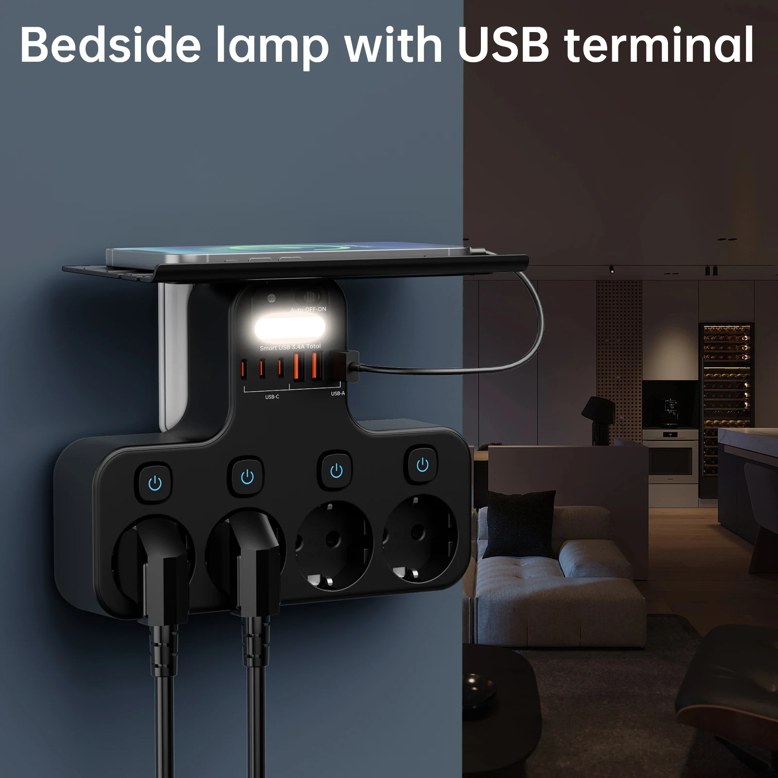4000W Eu Plug Power Strip Multifunction Socket Smart Night Light Independent Switch European Standard Outlet with USB C Ports