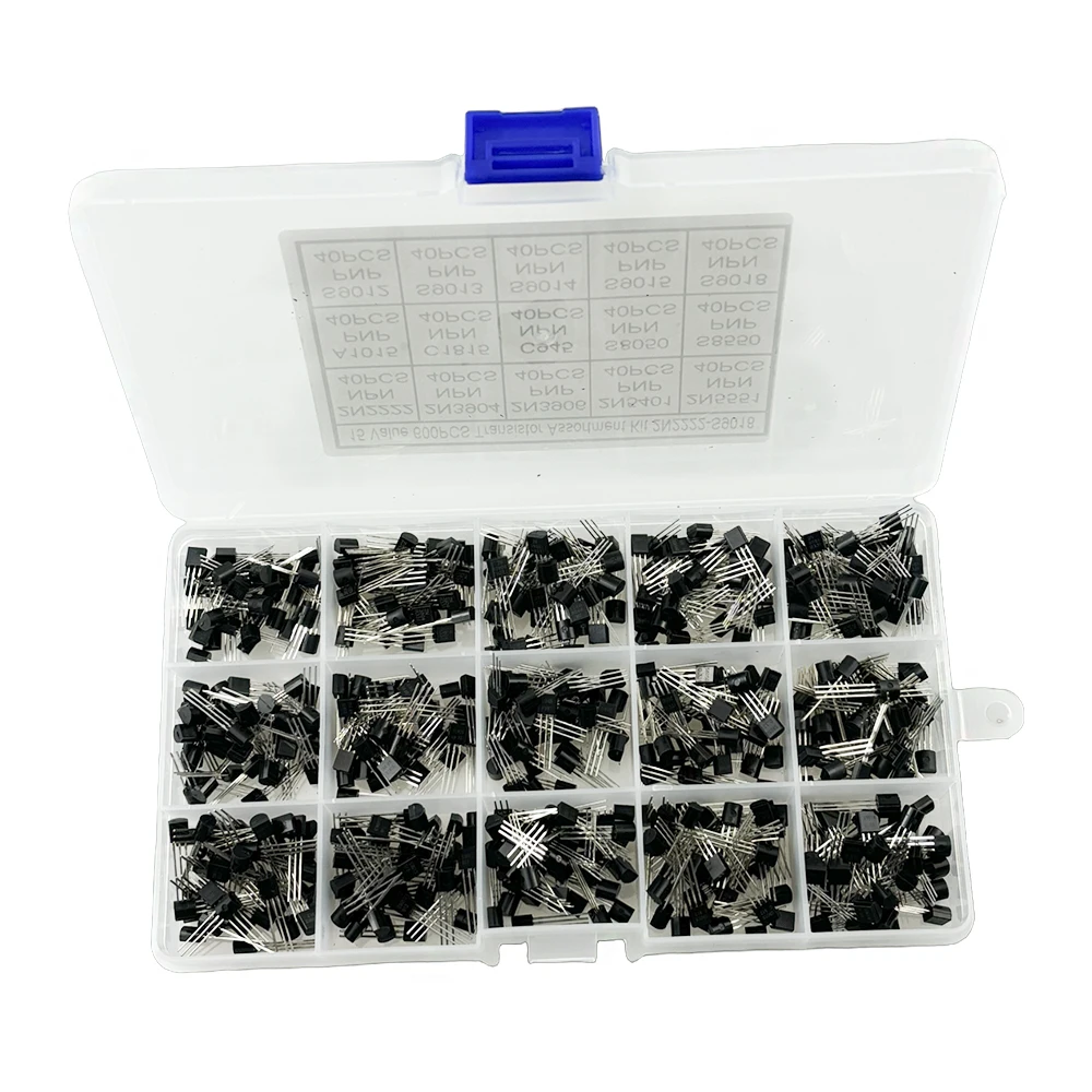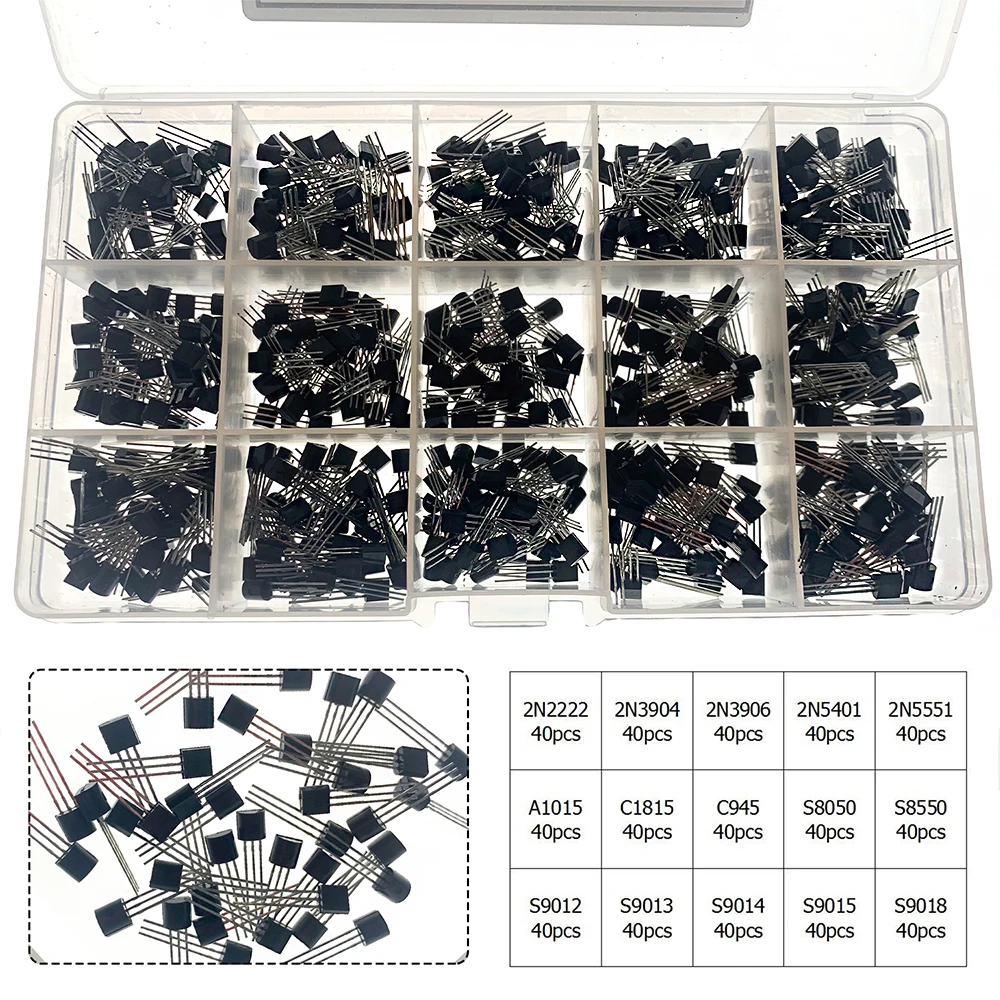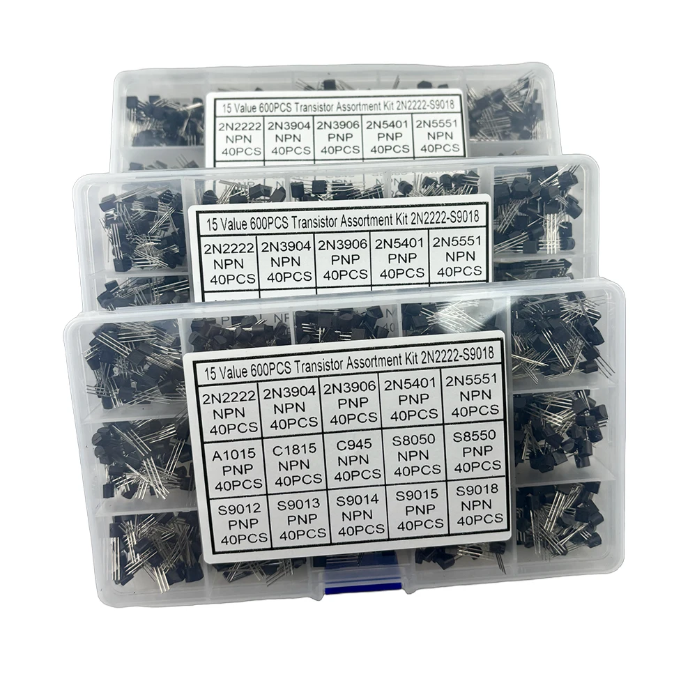 600pcs Transistor Kit A1015 C1815 C945 S8050 S8850 2N2222 2N3904 2N3906 2N5401 2N5551 PNP NPN S9012-S9015 S9018 15 Kinds