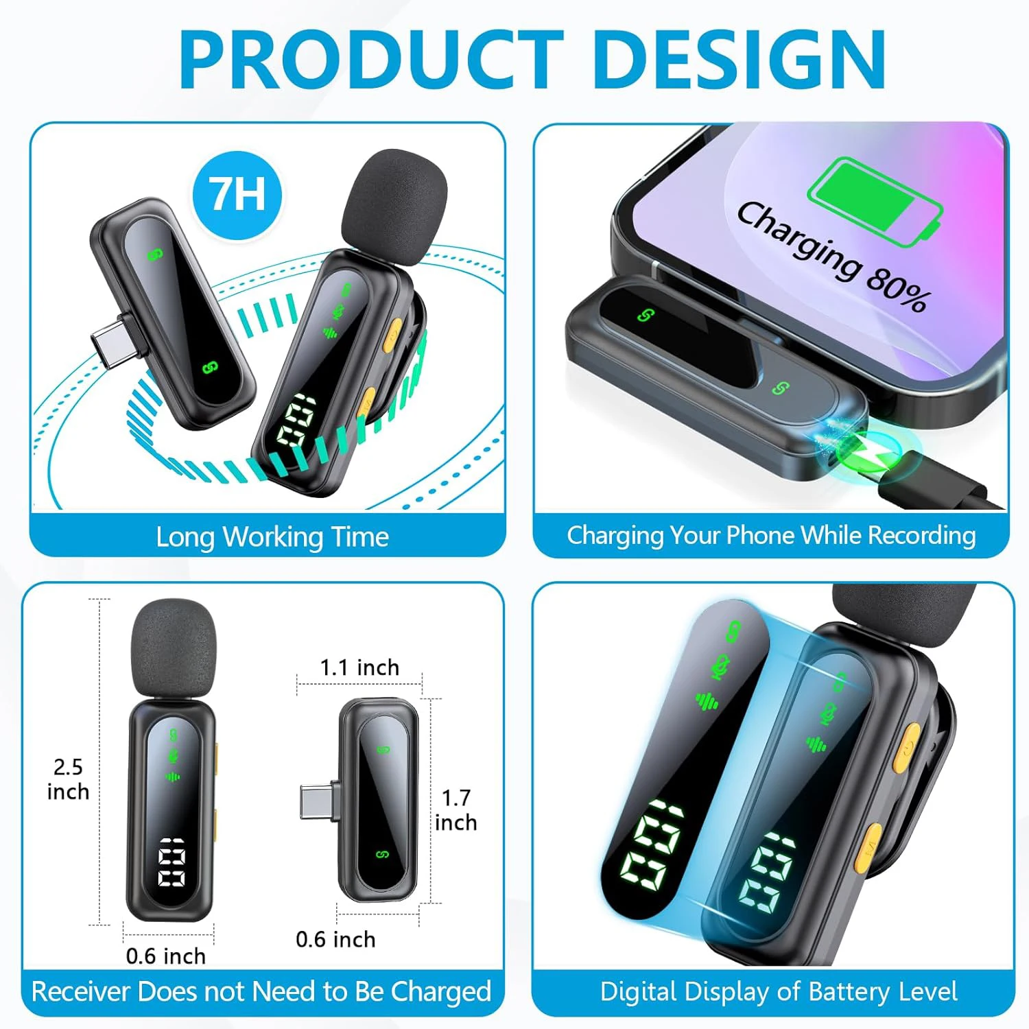 Professional Wireless Lavalier Microphone Plug and Play, with LED Power Display for Content Creators Recording, Live Streaming
