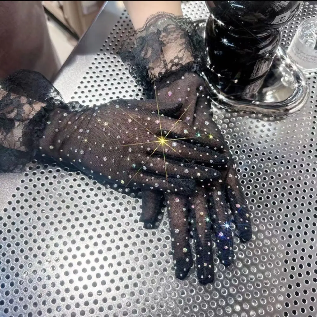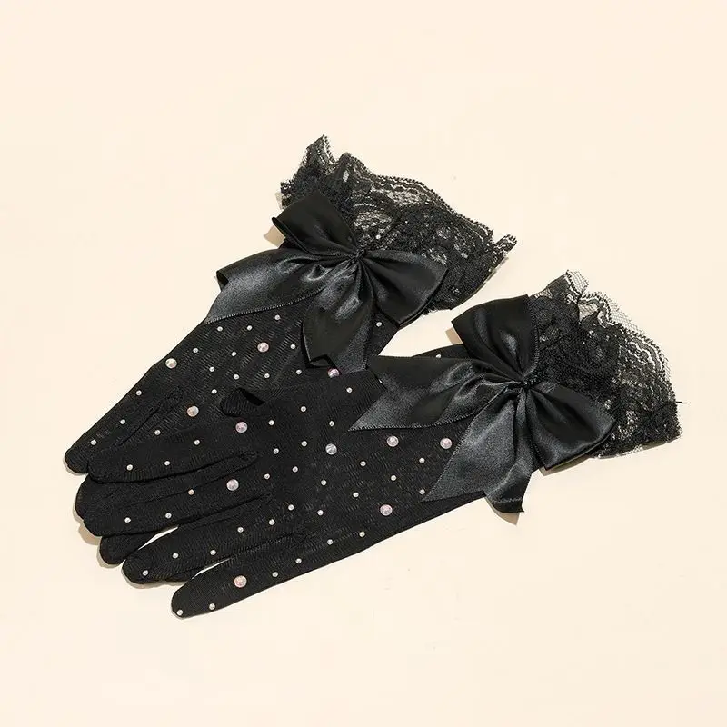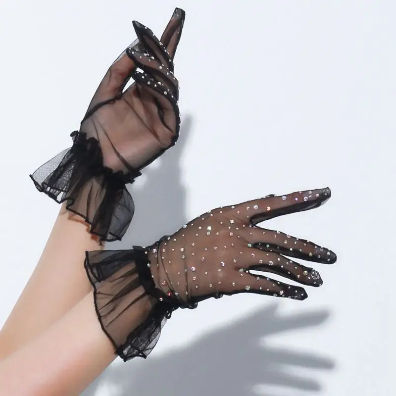 Women Transparent Shiny Pole Dancing High Stretch Gloves Stage Performance Cosplay Mesh Lolita Elegant Short Ruffle