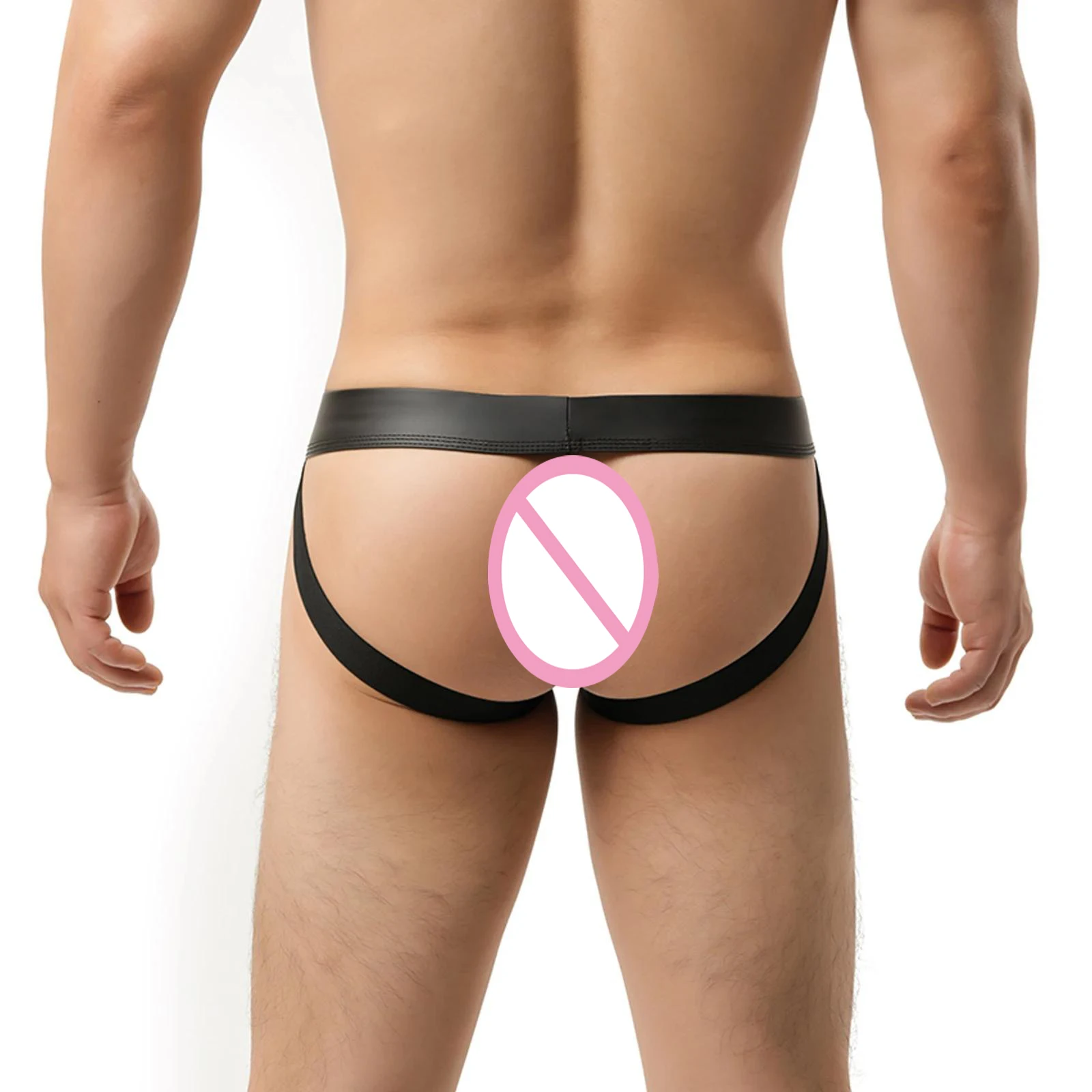 Men Detachable Pouch Faux Leather Anal Lingerie PU Hip-Baring Open Bottom Thong Penis Pouch Jockstrap Crotchless Panties