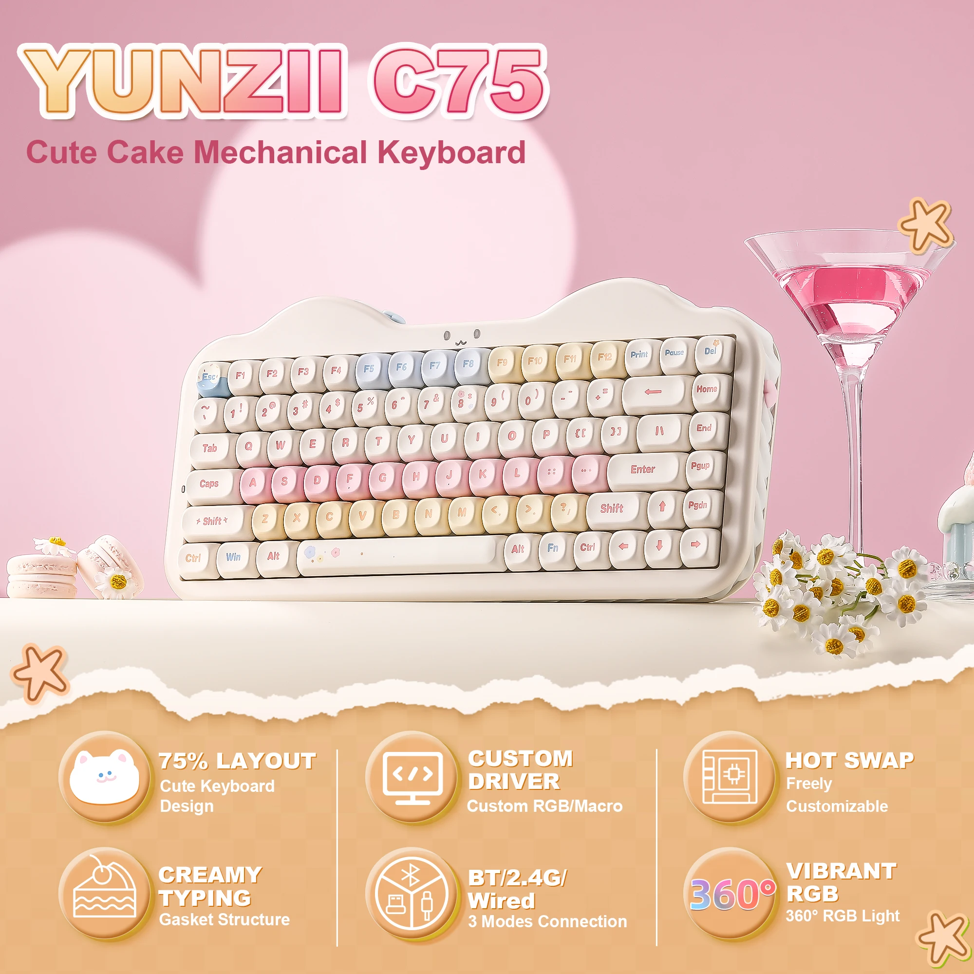 YUNZII C75 Wireless Mechanical Keyboard, 75% Creamy Hot Swap Custom RGB Keyboard, Gasket Cute Cake Design, for Win/Mac/Gaming