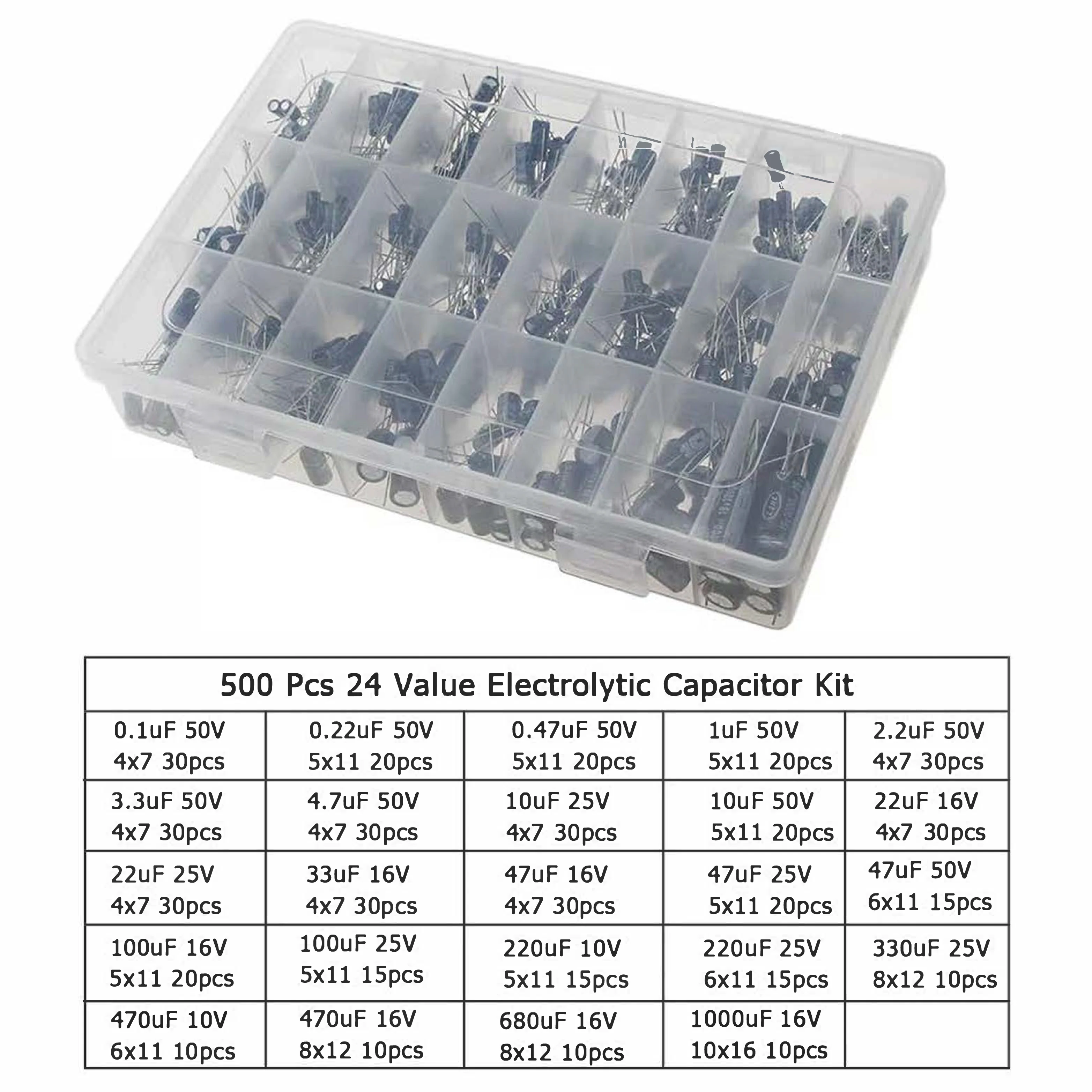 120/200/500Pcs 16V 25V 50V 0.1uF - 1000uF Aluminum Electrolytic Capacitor Assorted Kit Box 1uF 4.7uF 10uF 47uF 220uF 330uF 470uF