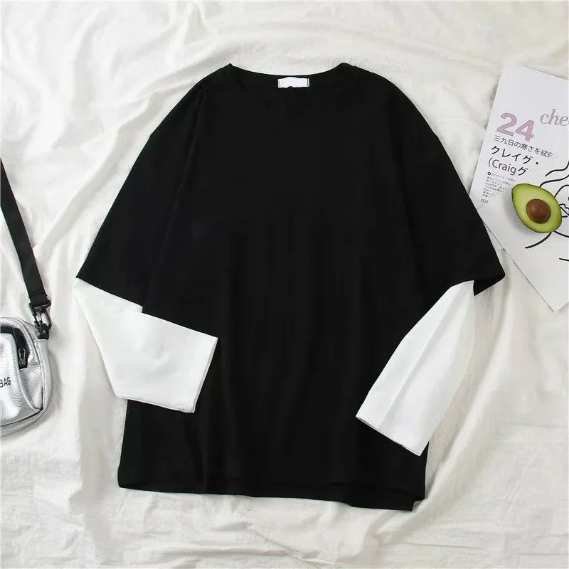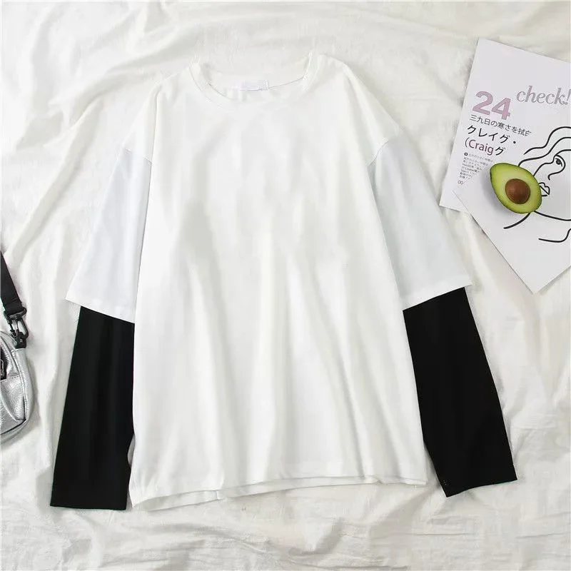 New Harajuku Black White Striped Y2K Long Sleeve Solid Color T-shirts Men Women Fall Fake Two Piece Long Sleeve Loose T-shirt
