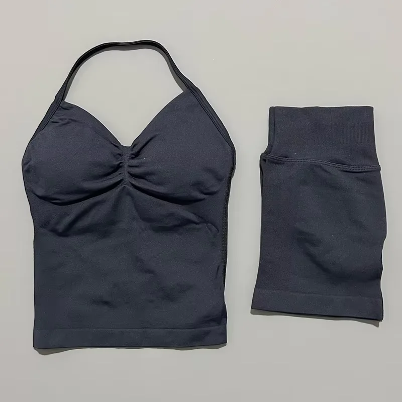 HISTELLO 2 Pieces Sports Set Women Yoga Longline Strap Top Scrunch Seamless Shorts Sport Gym Set Sportswear Workout Fitness Set