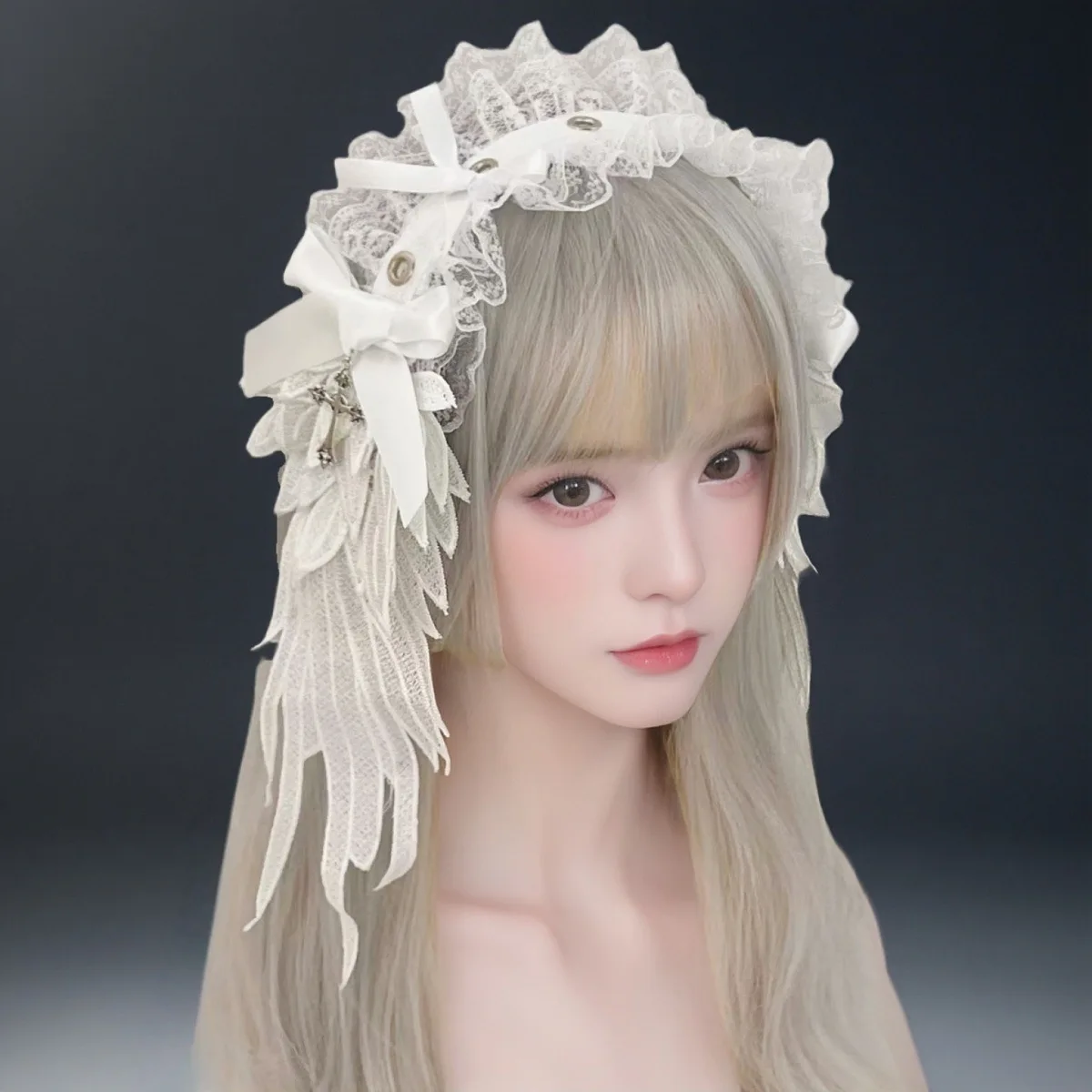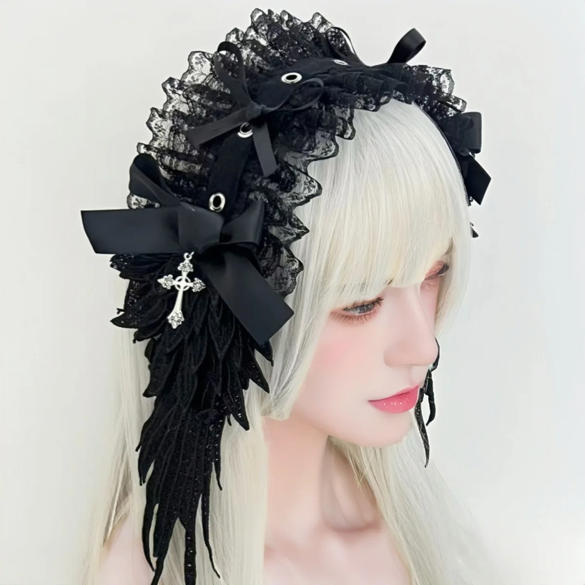 Women's Harajuku Steampunk Y2K lace Wing Headwear Bow Headband Lolita Gothic Dark Angel cross Headwear and Hair Accessories