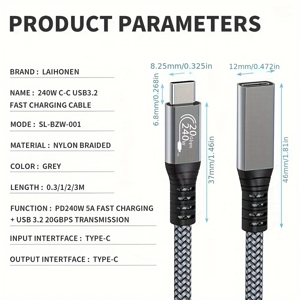 USB C extension cable 10ft 240W charging 20Gbps data transmission 4K Video USBC 3.2 Type C extension cable mobile phone etc