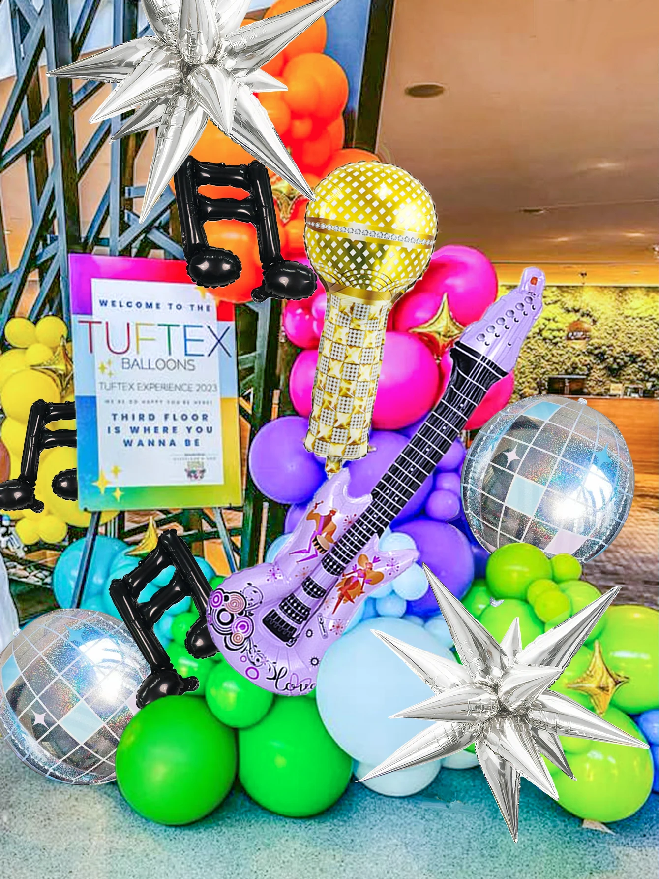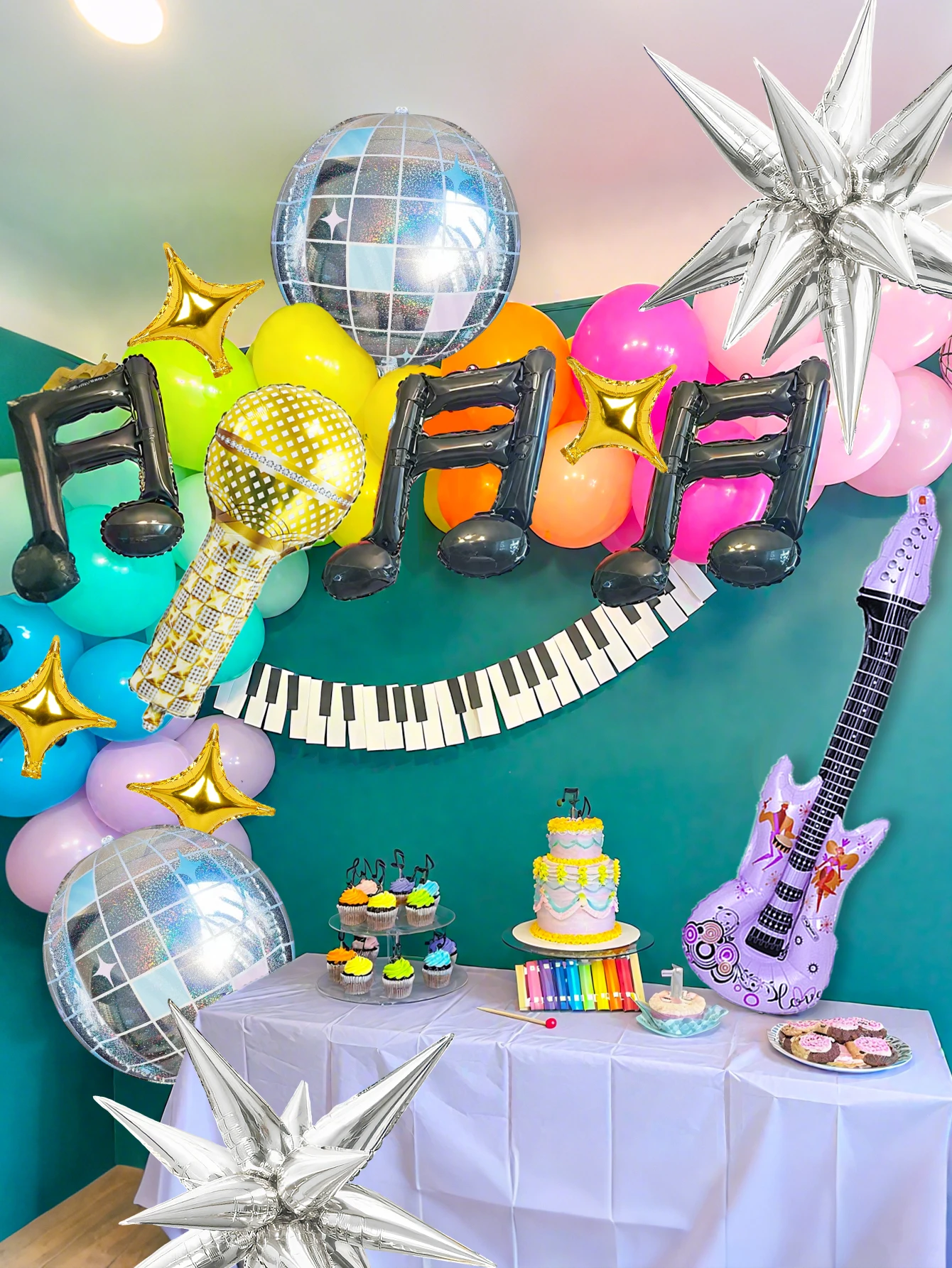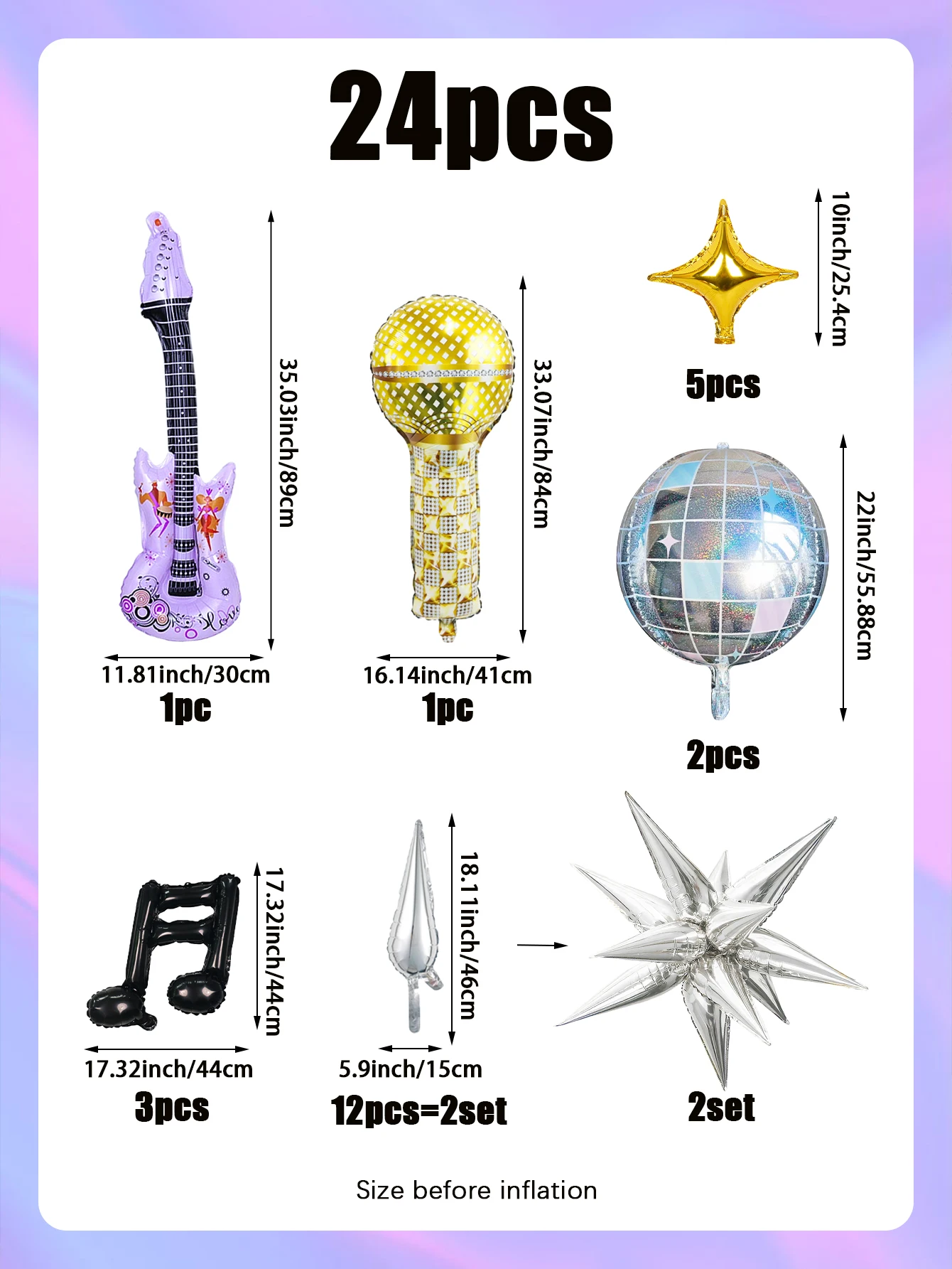 24pcs pop music guitar party balloon set, microphone & purple guitar & disco 4d ball & black musical note & star balloon