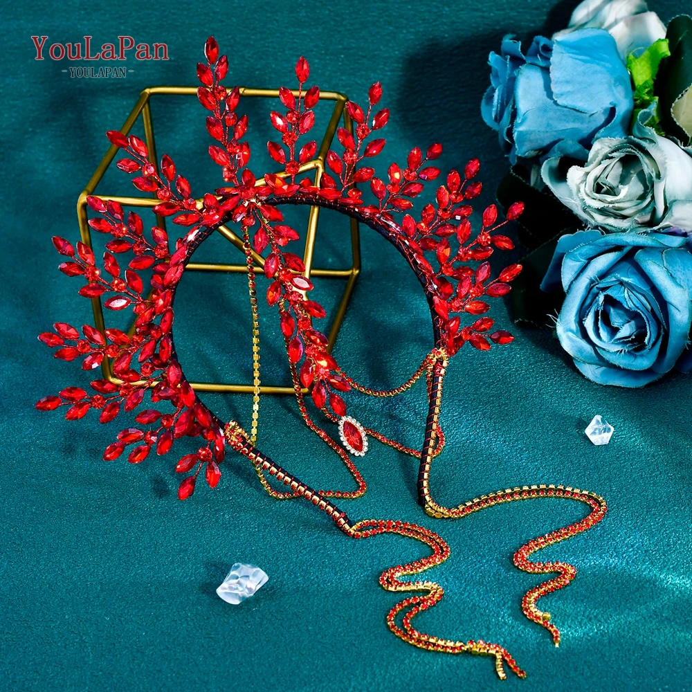 YouLaPan Luxury Bride Crown Head Hoop Tassel Wedding Headwear Hair Jewelry Red Color Rhinestone Headpieces Accessories HP952