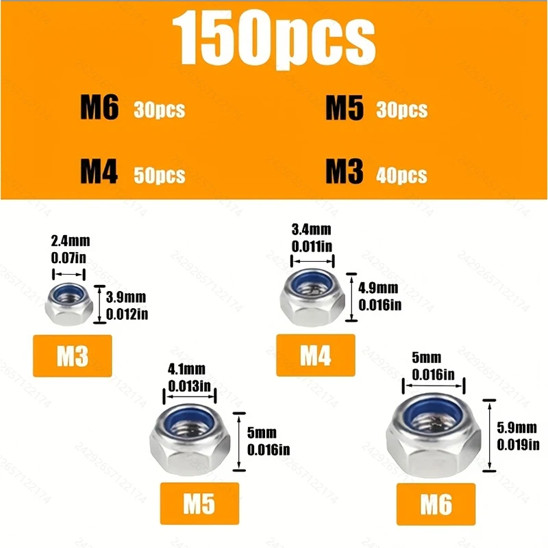 150pcs Stainless Steel Nylon Locking Nuts - Anti-Slip, Self-Locking, Hexagonal Cap, Full Thread, Right Thread, M3/M4/M5/M6, Dura