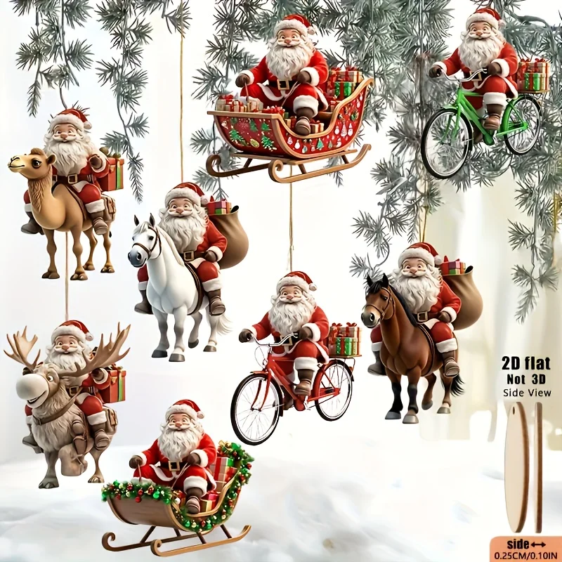 8pcs Different Riding Tools 2D Flat Santa Claus Wooden Ornament Set - Perfect for Christmas Trees and Holiday Home Decorations