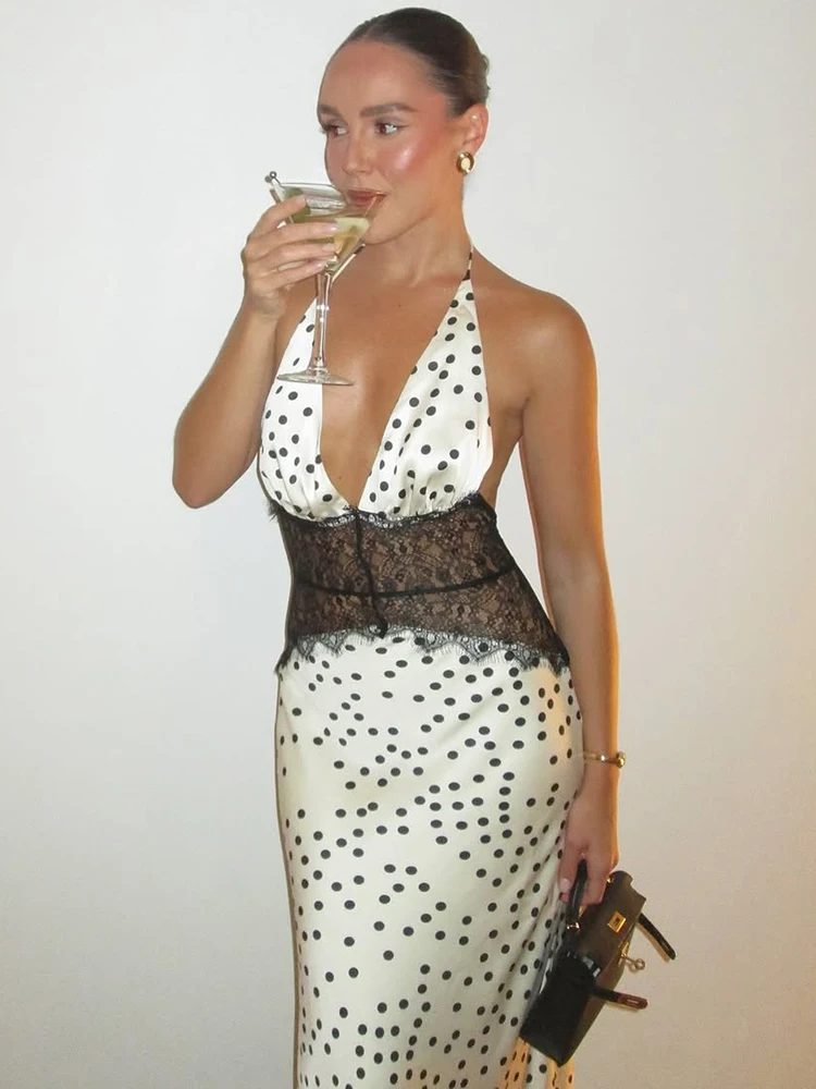 Mozision Polka Dot Backless Maxi Dress Women Gown Elegant Patchwork Lace Halter Deep V Neck Sleeveless Bodycon Club Dress
